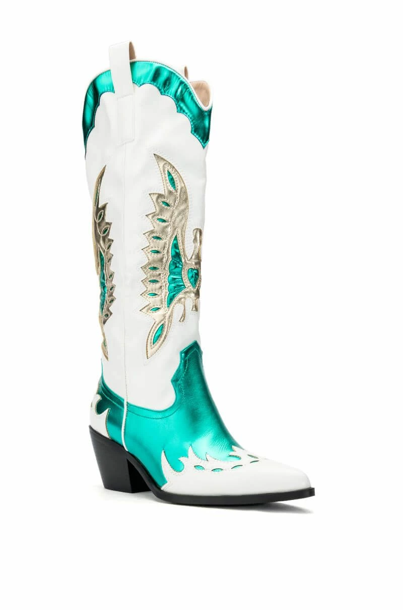 The AZALEA WANG Show Me Off Cowboy Boot In Green features a vegan leather upper, a Western-inspired mid-calf height shaft, a pointed toe silhouette, a chunky heel, pull tabs, and a slip-on fit. Complete with color block metallic contrast accents, butterfly-like patterning, and embroidered detailing.