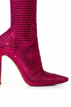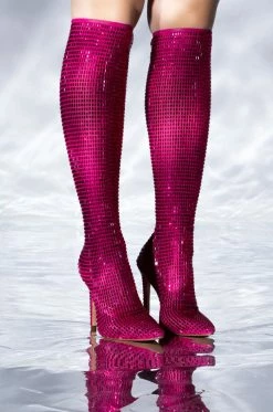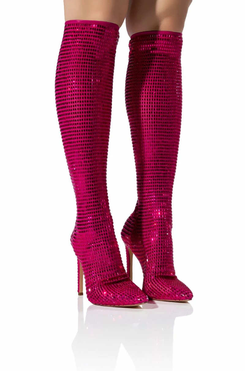 Glitter, glam, and comfortable stretch equal The AZALEA WANG Statue Embellished Stretch Boot In Pink. A rhinestone-embellished mesh exterior encompasses the boot and thin stiletto heel, complete with a pointed toe and knee-high fit. Amp up the sexiness with this pull-on fit heeled boot!