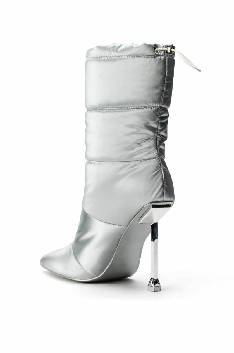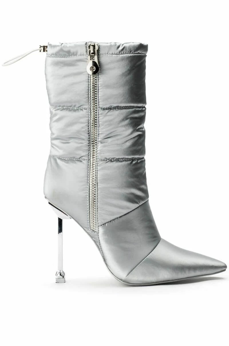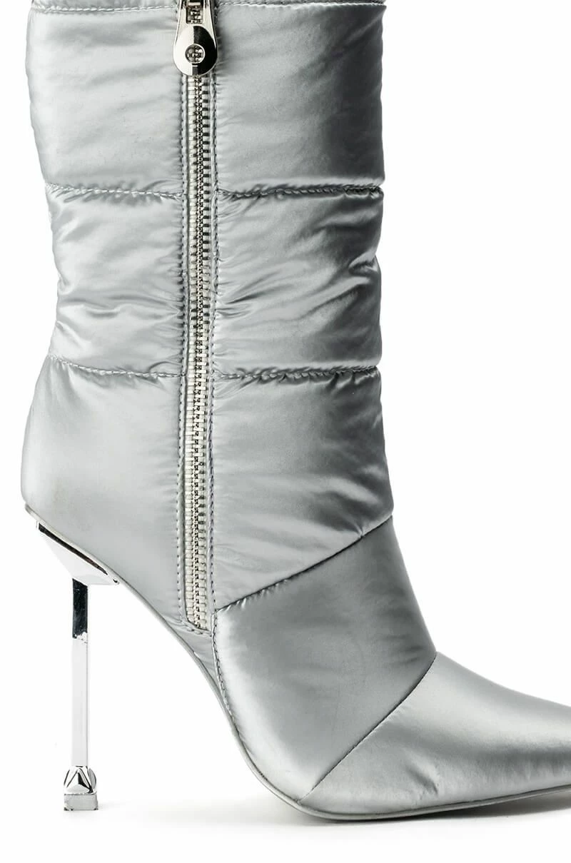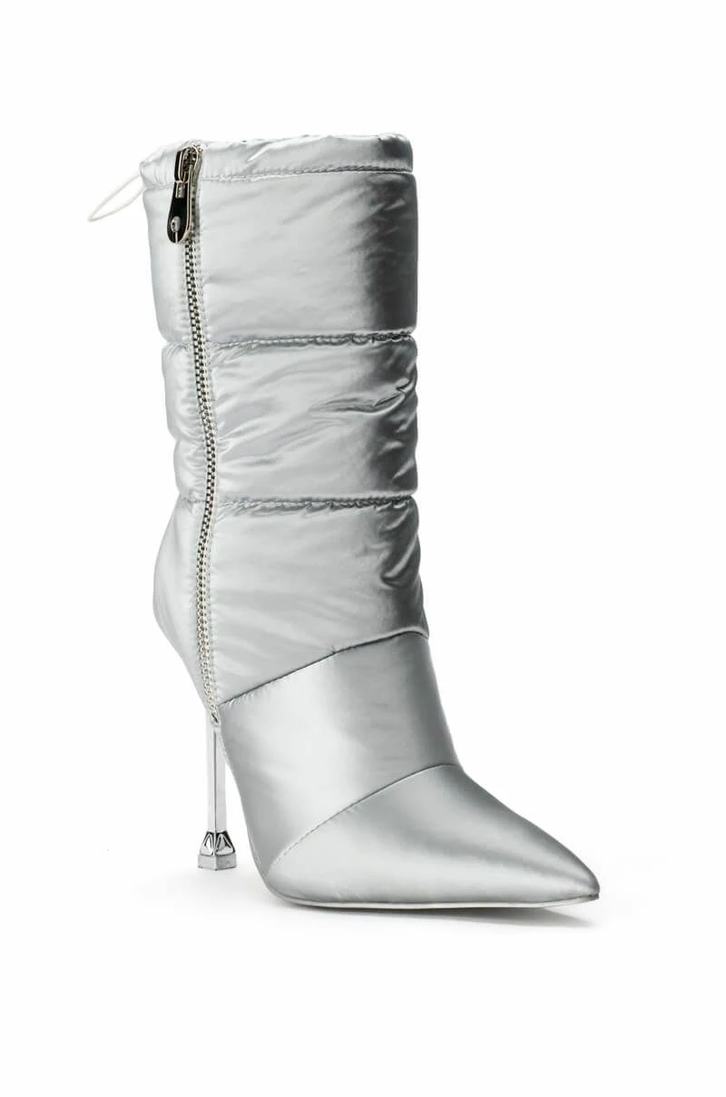We 3 all things puffer! This sexy, stylish pointy toe bootie adds an element of wintry-chic to any ensemble. The AZALEA WANG Stepping Out Stiletto Puffer Bootie In Silver features a nylon puffer fabrication, a mid calf shaft height, a pointed toe, a metallic stiletto heel, and an inner ankle zipper closure. Complete with an adjustable toggle drawstring at the top of the shaft for an adjustable fit.