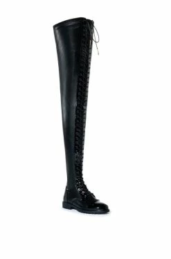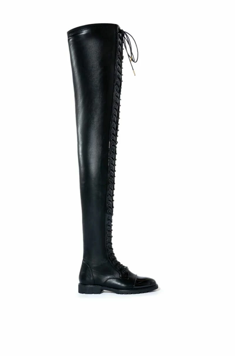 Your good intentions won’t be ignored, girl. The AZALEA WANG These Are My Only Intentions Thigh High Flat Boots lets them know your intentions aren’t cruel. These vegan leather thigh high gems have black lacing up the front on patent leather panels with a matching a rounded toe. Boots feature classic pull on fit with inner zipper closure. Wear with festive plaid or a mini skirt to show your crystal-clear intentions.