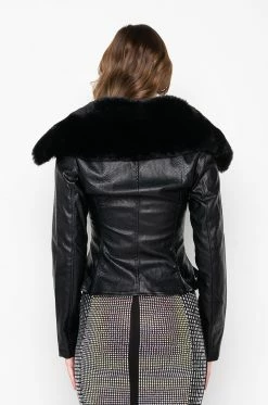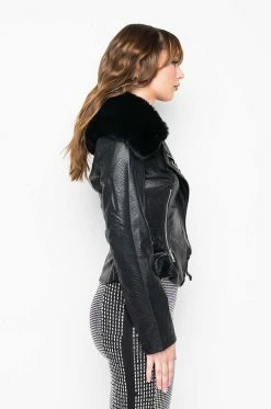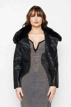 It’s always time with The AZALEA WANG Time For Love Croc Moto With Faux Fur. This posh jacket features a croc faux leather fabrication body, long sleeves, a foldover plush faux fur collar, a waist length silhouette, side zipper extenders, and a front zipper closure. Style this jacket with a pair of skinny jeans and stiletto booties.