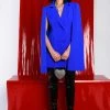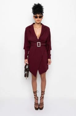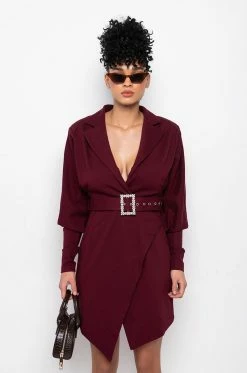 The AKIRA Label Diamond Ball Rhinestone Corset is made from a stretchy fabrication, and is complete with a low cut notch lapel neckline, a split hemline, long sleeves, padded shoulders, a mini length, a buckled waist belt, and a side zipper closure.