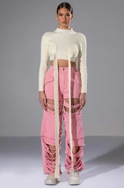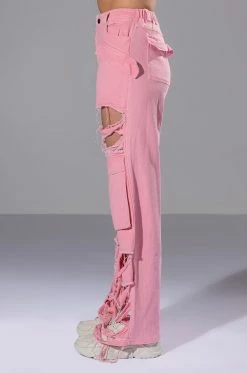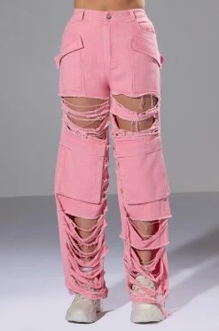 Sisterhood of the traveling cargos. The AKIRA Label Besties Favorite Distressed Cargo Pants are a vibrant take on cargo denim featuring a high rise waist, slant side pockets, dual flap front cargo pockets, a wide leg silhouette, and ultra-distressed detailing along the thighs and shins. Complete with a zip button front closure and a cinched elastic back waistband. Pair this piece with a button down and loafers to finish off your amped-up casual look.