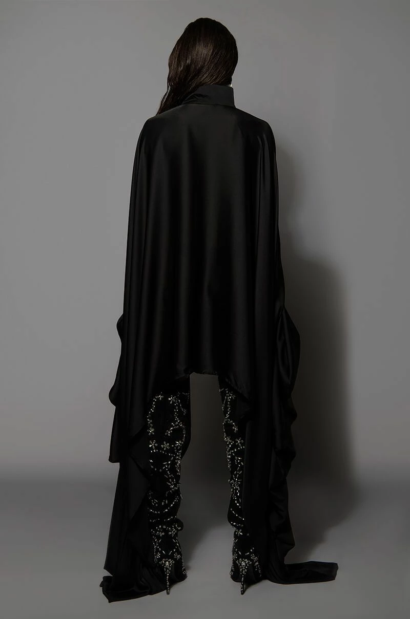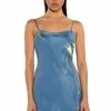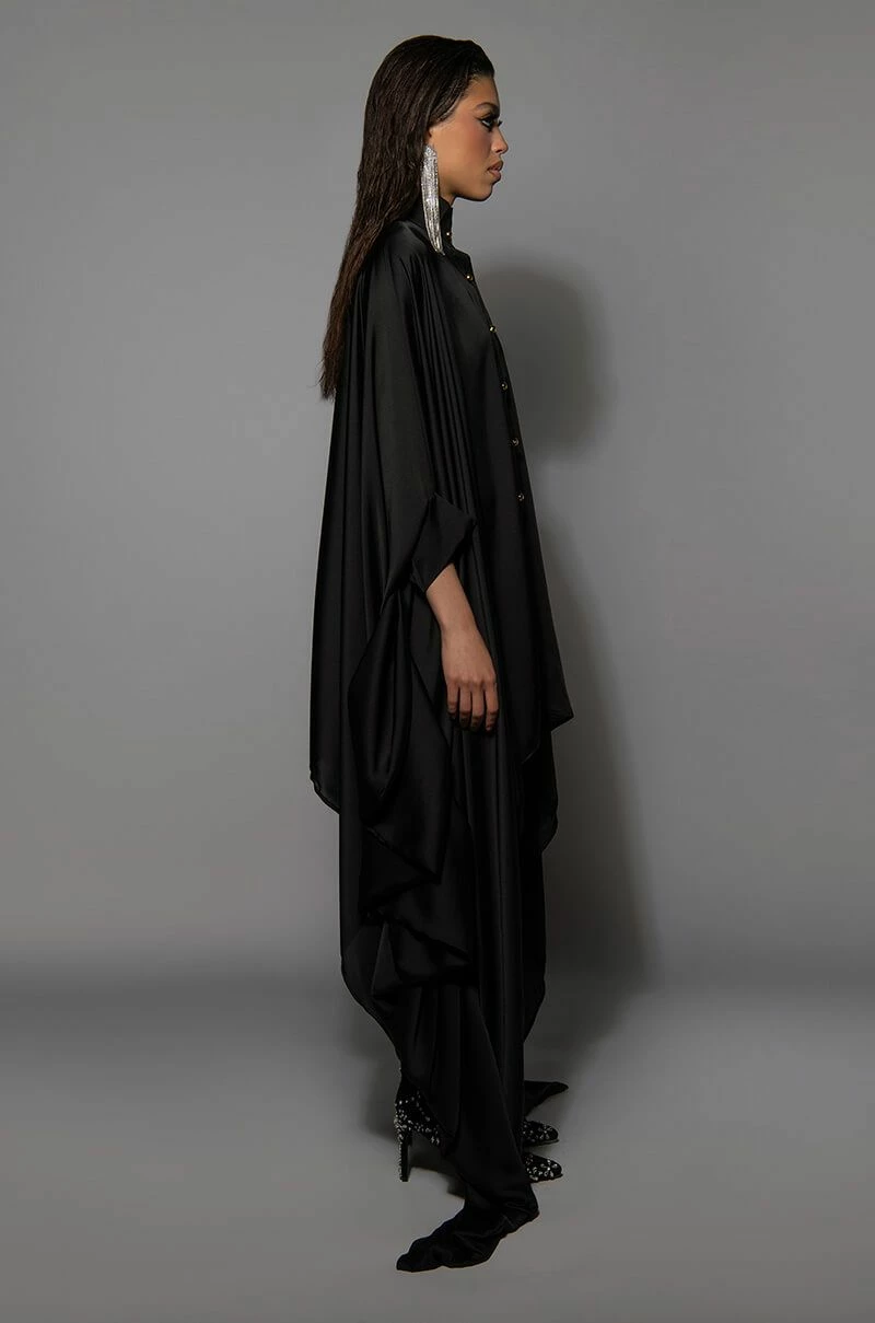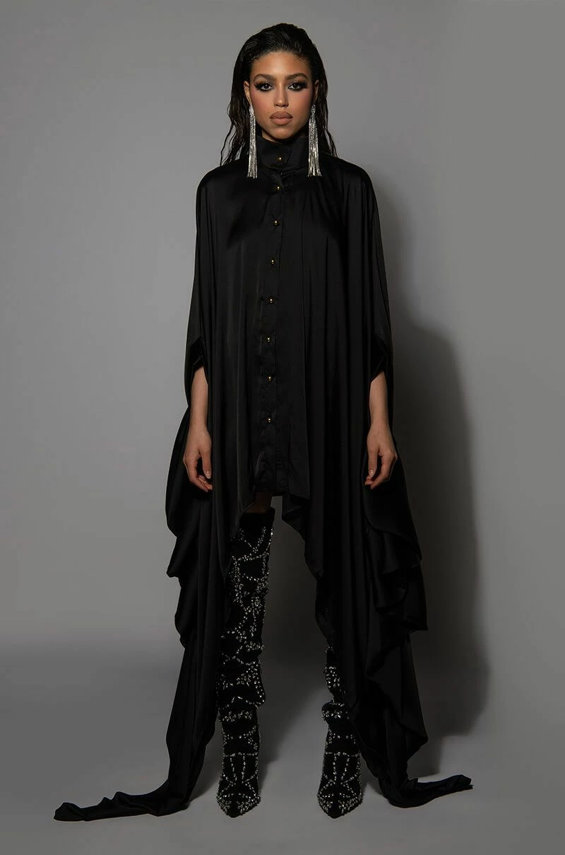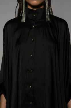 The AKIRA Label Better Off Button Down Dress features a sleek, smooth fabrication, a collared neckline, a button down front placket, a curved high low hem, and ultra-long blouson sleeves. Complete with ruffled extended cuffs and a mini length silhouette.