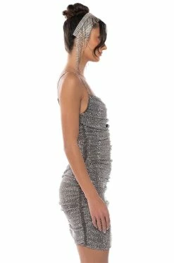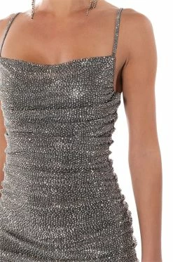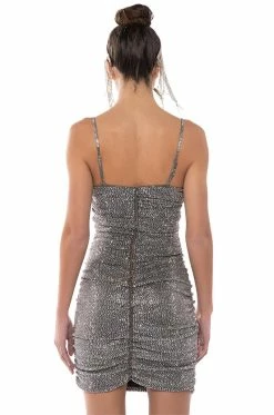 The AKIRA Label Better Than Ever Sleeveless Rhinestone Mini Dress is made from a shimmering glitter fabrication and features adjustable spaghetti straps, a cowl neckline, a sexy bodycon fit, rhinestone and ruched body detailing, polyester lining, and a mini length silhouette. Complete with a tonal back zipper closure. Pair this snazzy piece with strappy sandals and a faux fur coat to finish off your look.
