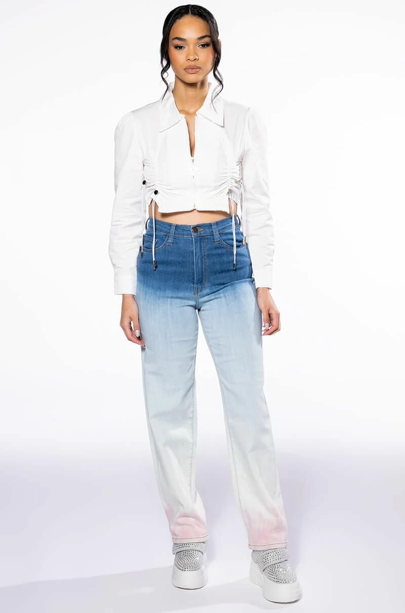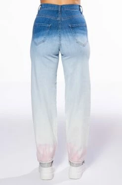 The Brooklyn Baby Ombre High Rise Jeans feature a stretch denim fabrication, an ombre colorway, a five pocket design, a high rise waistline, a straight leg silhouette, and a classic button up and zipper closure. Style these pants with a baby tee and high top sneakers!