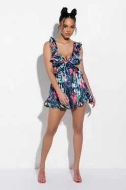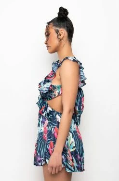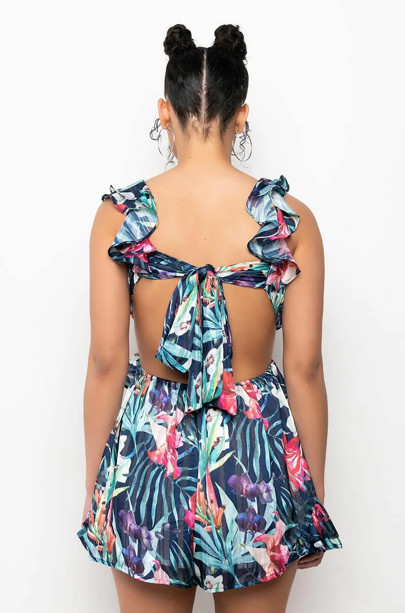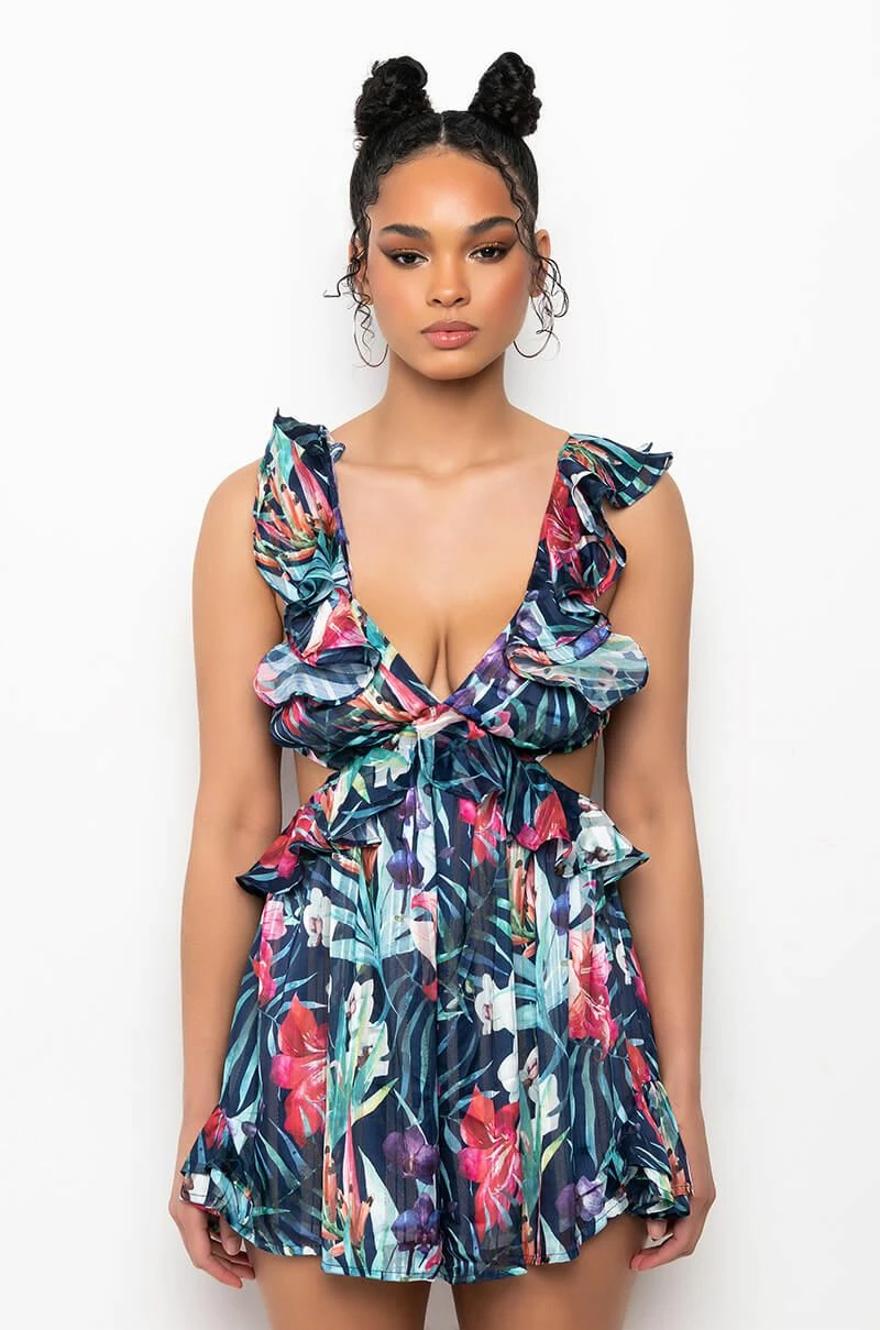 The AKIRA Label Brunch Alert Ruffle Mini Dress features a sheer chiffon overlay, a v neckline, ruffled tank straps, a backless design, tie back detail, and sexy side cutouts. Complete with ruffled skirt detailing, tropical print patterning, subtle metallic pinstripes, a smooth polyester lining, and an elastic back waistband.