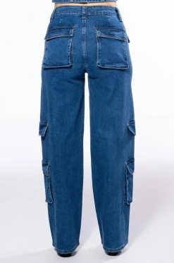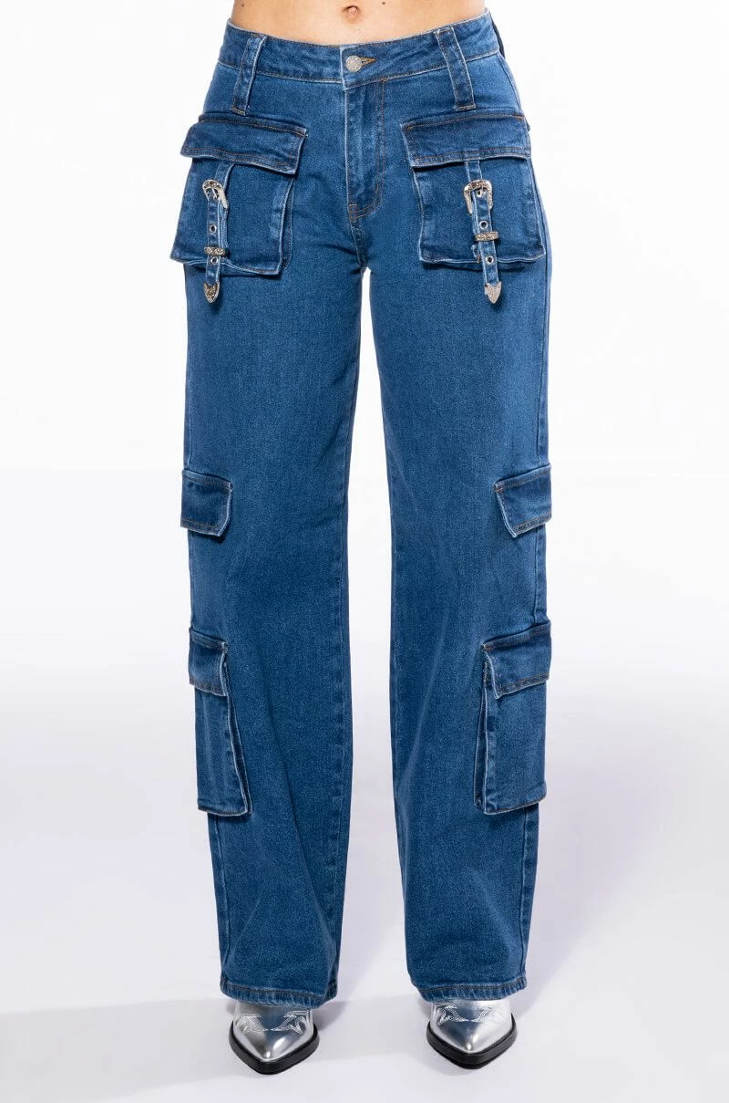 Sexy and chic, The Akira Label Calypso Mid Rise Wide Leg Jeans are essential for your denim rotation! With its wide leg cargo design, these pants feature multiple patch side pockets, a mid-rise waist, patch cover back pockets, and two adjustable western-style belted pockets at the front. Pair with the matching top, The Akira Label Calypso Denim Halter Neck Top, some pumps, and you’re ready to go!
