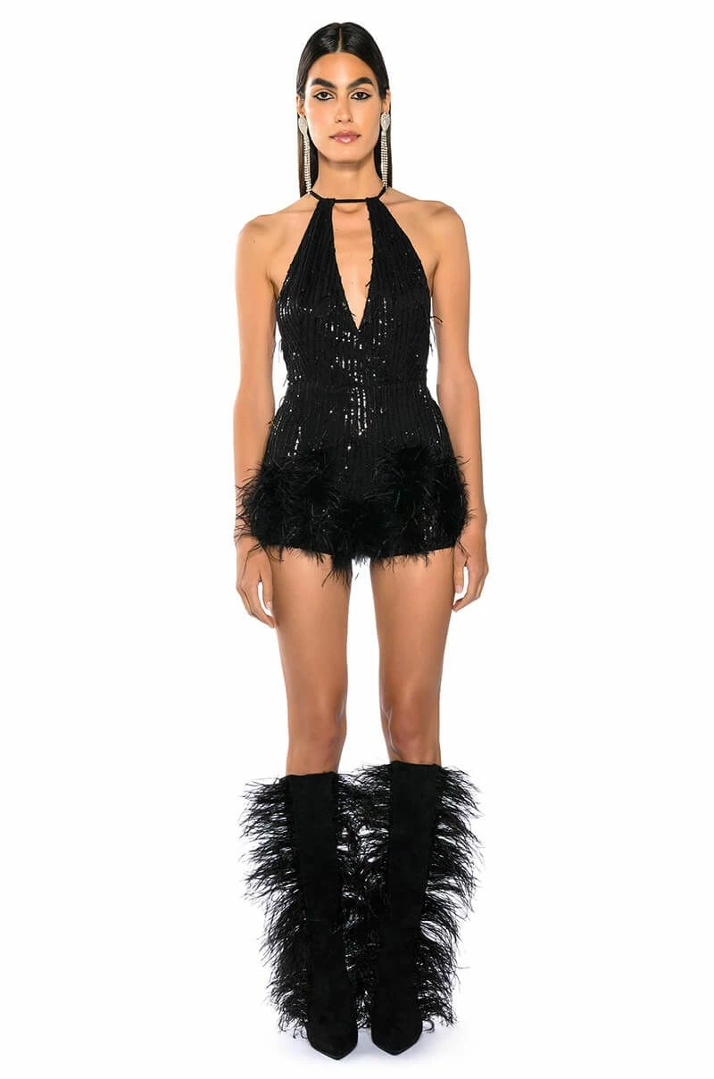 The AKIRA Label Cat’s Meow Sequin Fringe Feather Trim Romper is made from a layered mesh fabrication and features sequin fringe body detailing, adjustable cross-back spaghetti straps, a plunging wrap front neckline, slick lining, attached shorts with opulent feather trim, and a tonal back zipper closure.