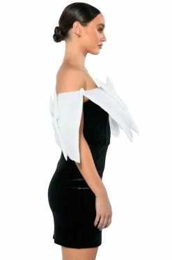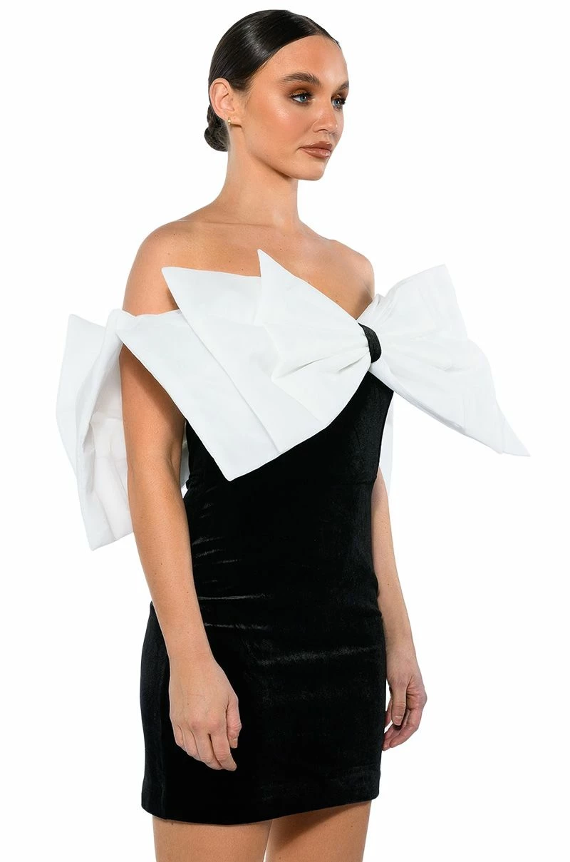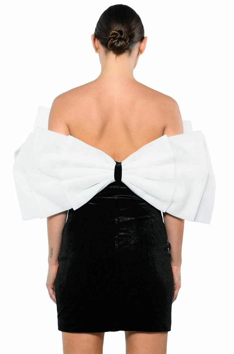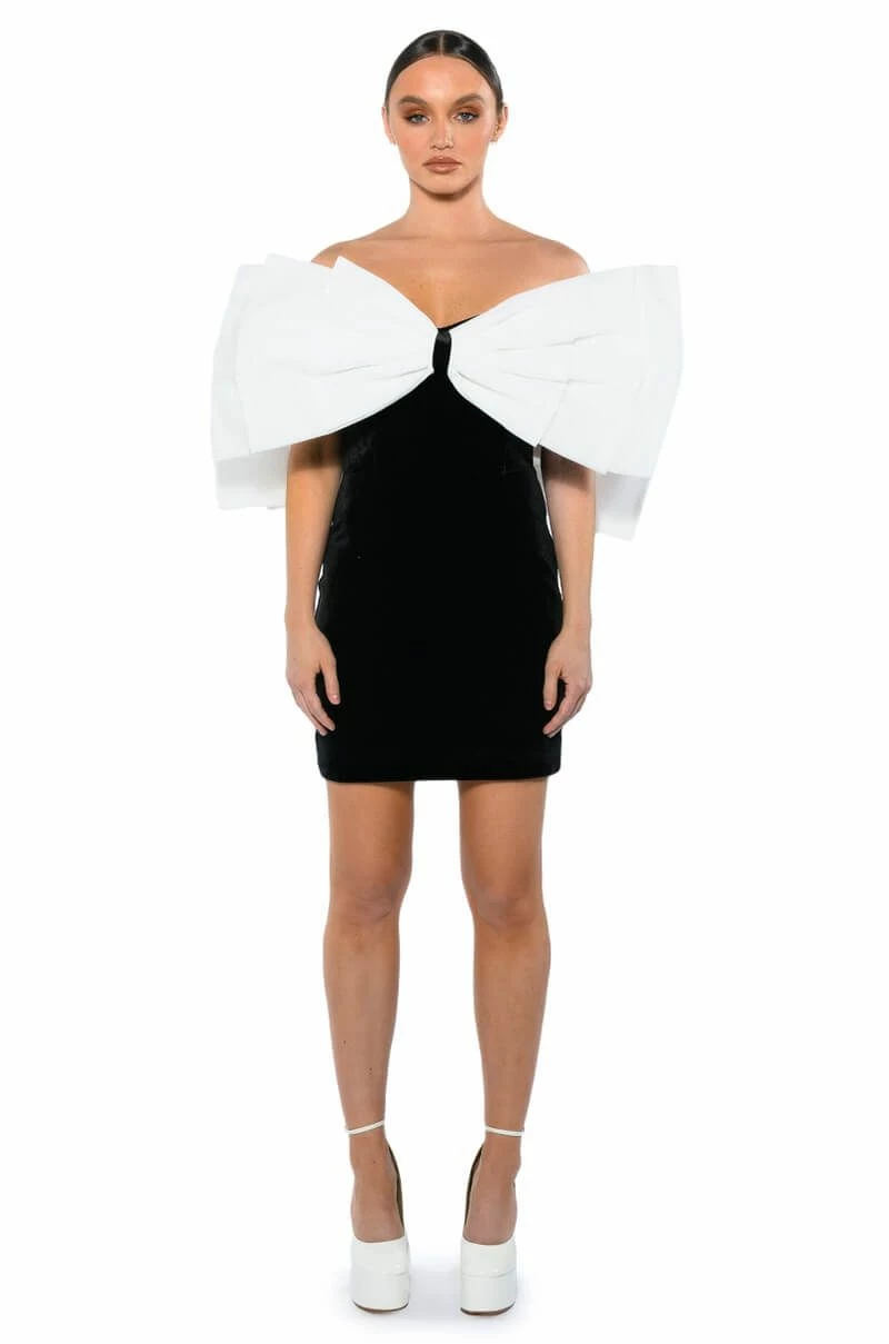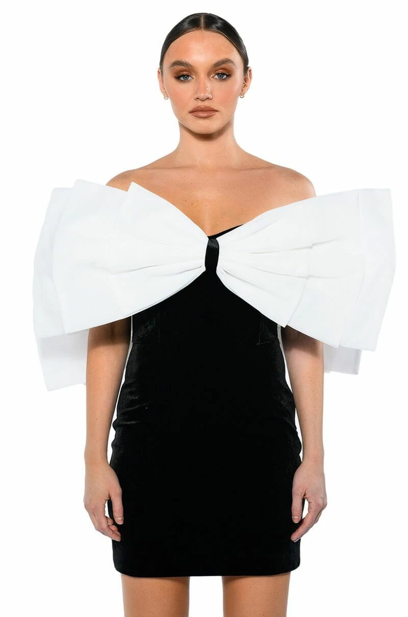 The AKIRA Label Celine Statement Bow Velvet Mini Dress is made from a soft velvet fabrication and features a sweetheart neckline, a large, reinforced statement bow with snap button top closures to mimic sleeves, boning for structure, a mini length silhouette, a bodycon fit, and a side zipper closure. Pair this piece with sheer tights and pumps to complete your look.