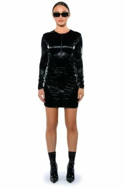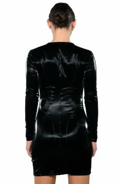 The Akira Label Choose Me Faux Leather Zip Up Mini Dress is made from a vegan patent leather fabrication and features a rounded neckline, long sleeves, corset body stitching, a sexy bodycon fit, a mini length silhouette, and a front zipper closure. Pair this piece with tights and patent leather booties to complete your look.