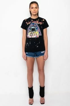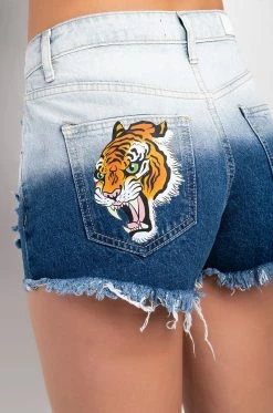 The AKIRA Label Come Clean Ombre Wash Cut Off Denim Short is made from distressed denim and features a high rise waistline, ombre wash, frayed hem, five pocket design with a printed graphic of a fierce tiger on the left butt cheek, and a classic button and zipper closure.
