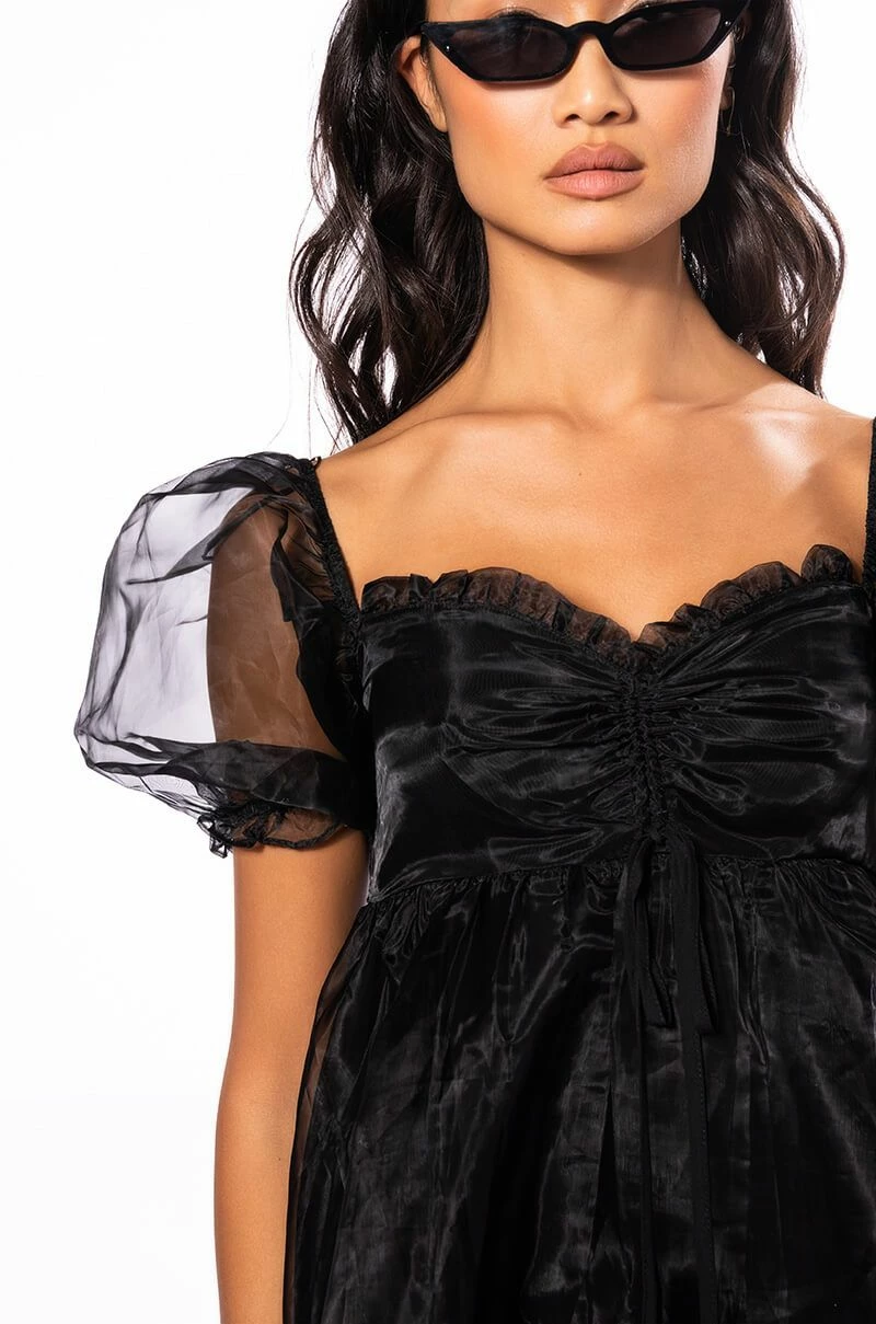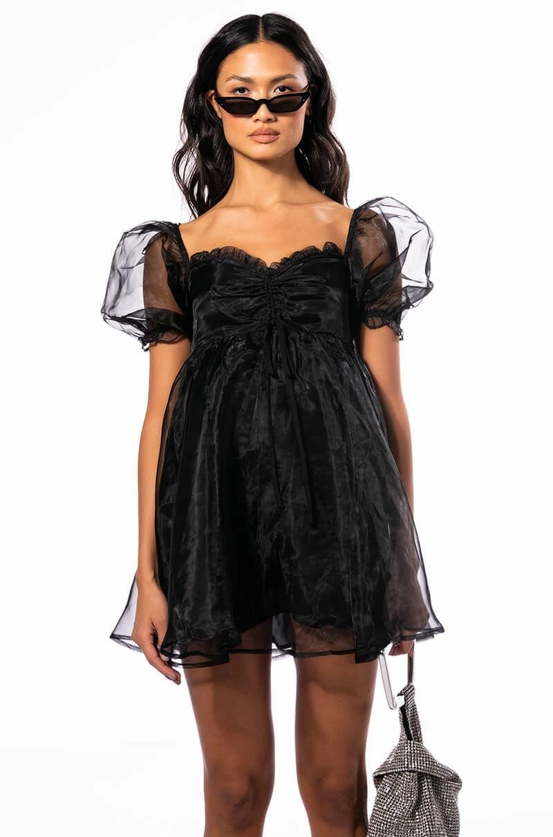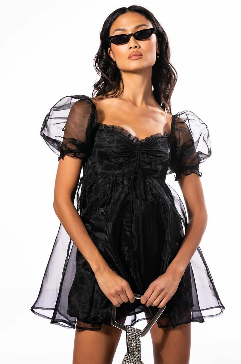 Satisfy your sweet tooth with The AKIRA Label Miss Honey Long Sleeve Babydoll Mini Dress! This sweet mini is made from a chiffon fabrication overlay and features a sweetheart neckline, ruched bodice drawstring detailing, long puff sleeves, an empire waist babydoll silhouette, smooth inner lining, and a shirred elastic back. Pair this piece with platform pumps and a clutch to finish off your cutesy look.