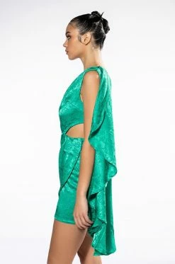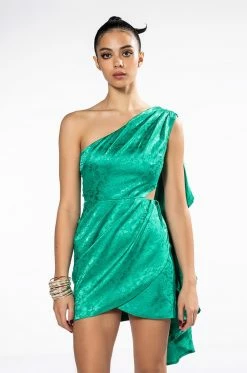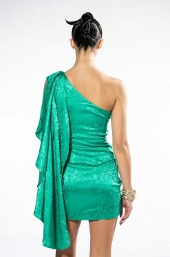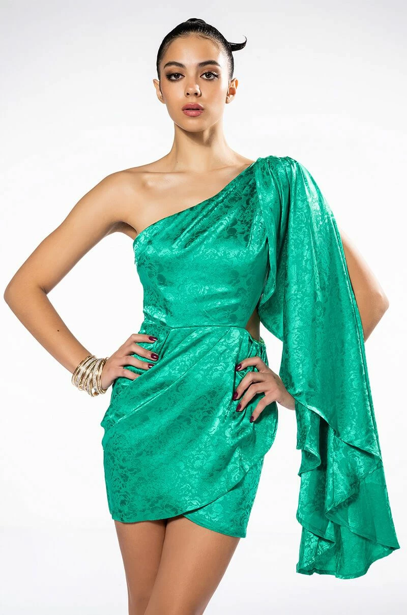 The AKIRA Label Curtain Call One Shoulder Cascading Sleeve Satin Mini Dress is made from a floral pattern-embossed satin fabrication and features a chic one shoulder neckline, a cascading one sleeve silhouette, a sexy side cutout, a pleated wrap front skirt, mini length, and a tonal side zipper closure.