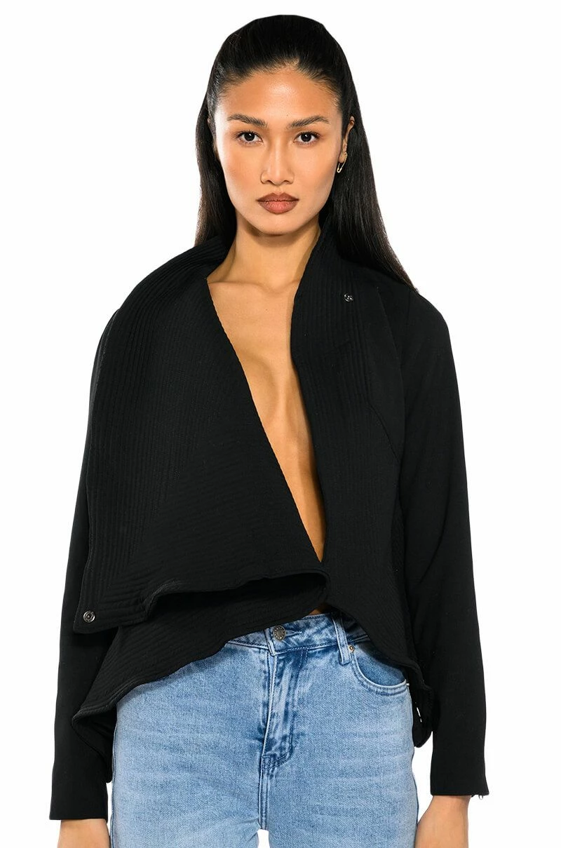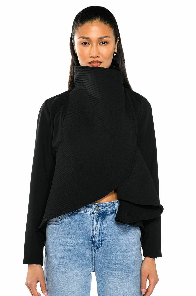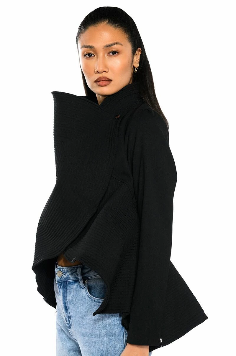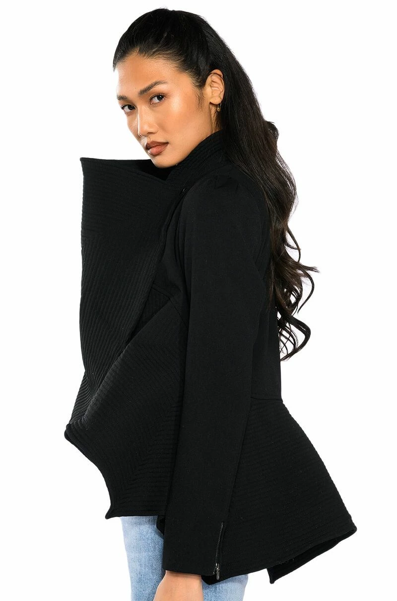 The AKIRA Label Darkest Knight Moto Jacket is made from a structured knit fabrication and features a warped standing collar, quilted body detailing, long sleeves with zipper cuffs, a tulip hem, and a snap button front closure.