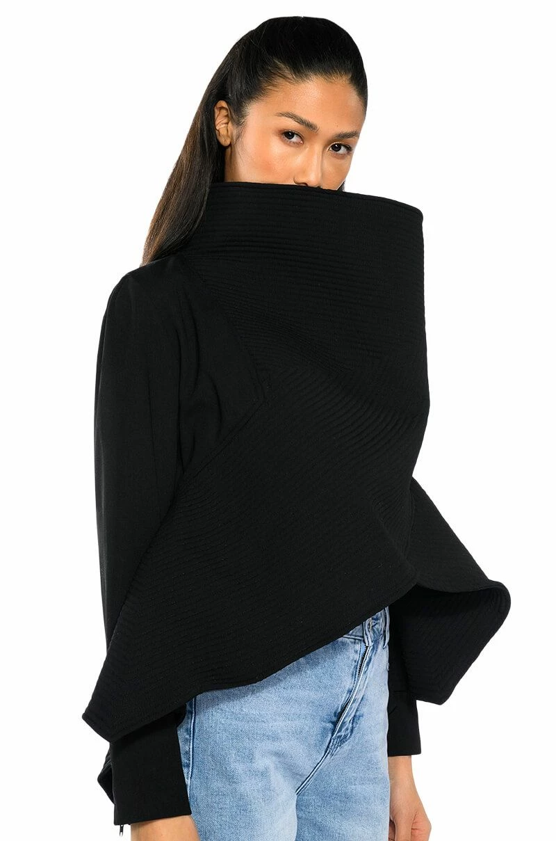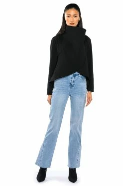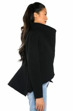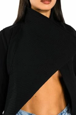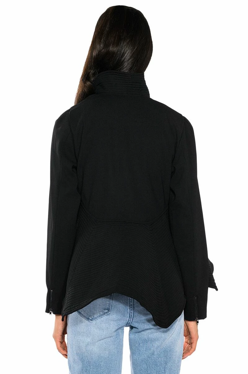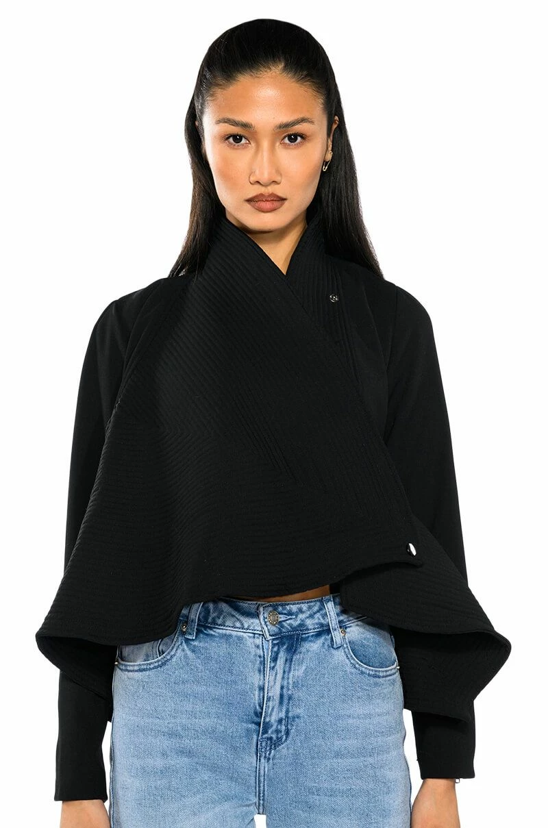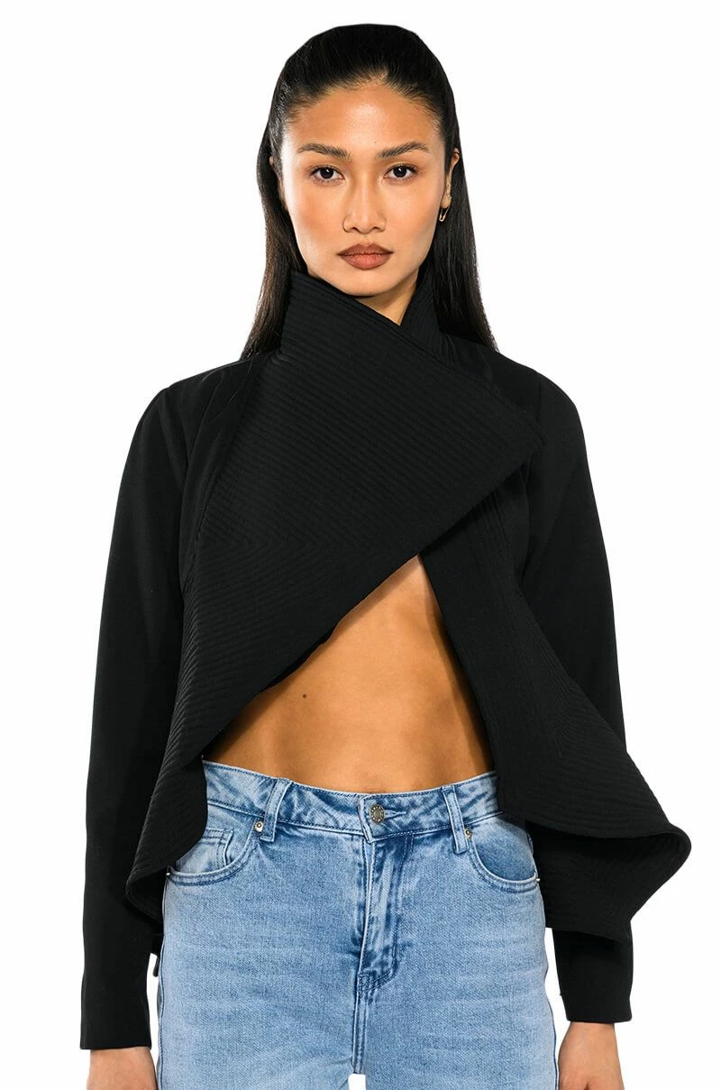 The AKIRA Label Darkest Knight Moto Jacket is made from a structured knit fabrication and features a warped standing collar, quilted body detailing, long sleeves with zipper cuffs, a tulip hem, and a snap button front closure.