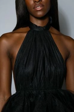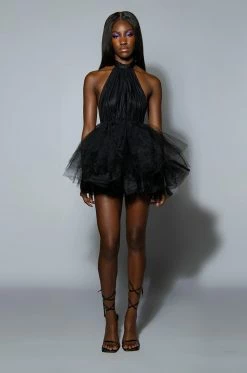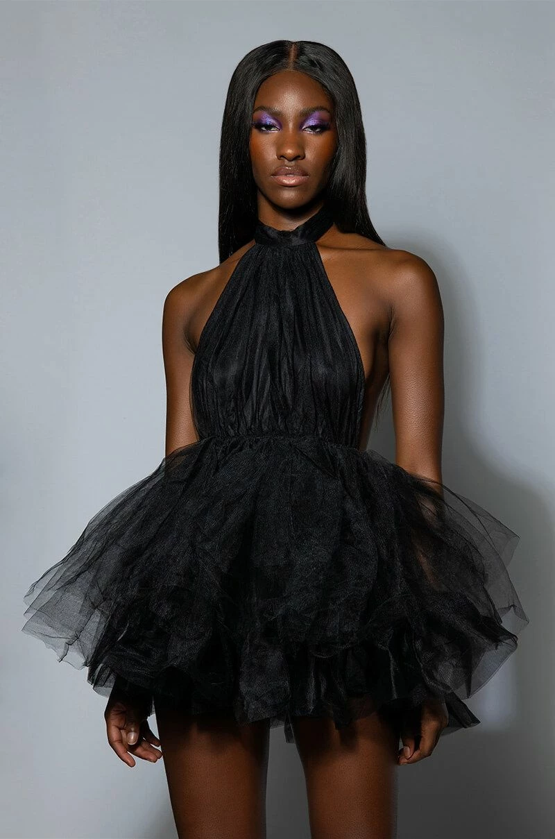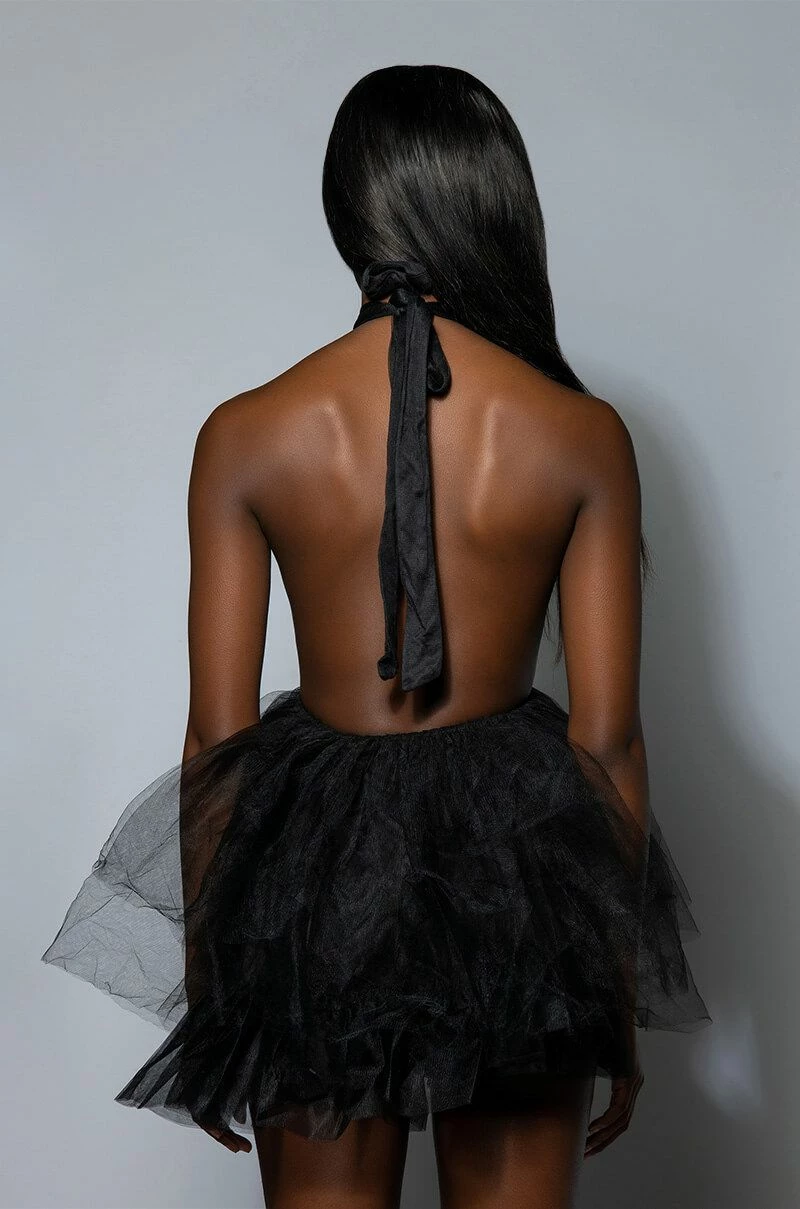 Isnβt she precious? The AKIRA Label Darling Diva Tulle Halter Neck Mini Dress In Black is made from a lightweight tulle fabrication and features a self-tie halter neckline, a sleeveless design, an elastic waist, layered tulle detailing, and a gorgeous open back. Complete with a mini length silhouette, a flared skirt with a slick inner lining, and a slip-on fit. Style with platform pumps and a statement piece clutch for the full fantasy!