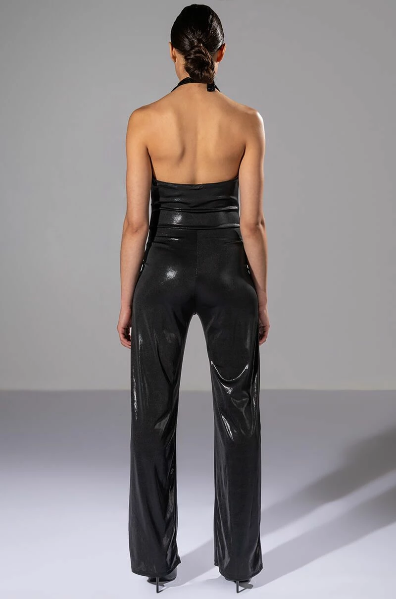 The AKIRA Label Do Better Metallic Cowl Neck Jumpsuit is made from a lightweight, stretchy fabrication and features an iridescent cowl neckline, halter design, straight pant legs, an open back with adjustable halter neck band, and a slip-on fit. Pair this piece with a cropped fur coat for a luxe look!