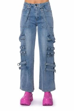 The AKIRA Label Dont Take Him Back Wide Leg Suspender Cargo Jeans are made from a washed denim fabrication and feature a high rise waist, working suspenders, belt loops, patch front pockets, cargo flap side pockets, D-ring denim belt detailing, and a wide leg silhouette. Complete with a front button and zipper closure.
