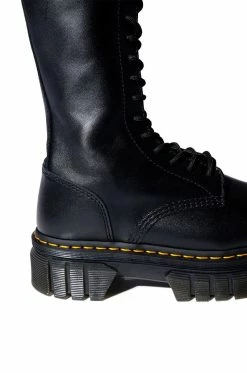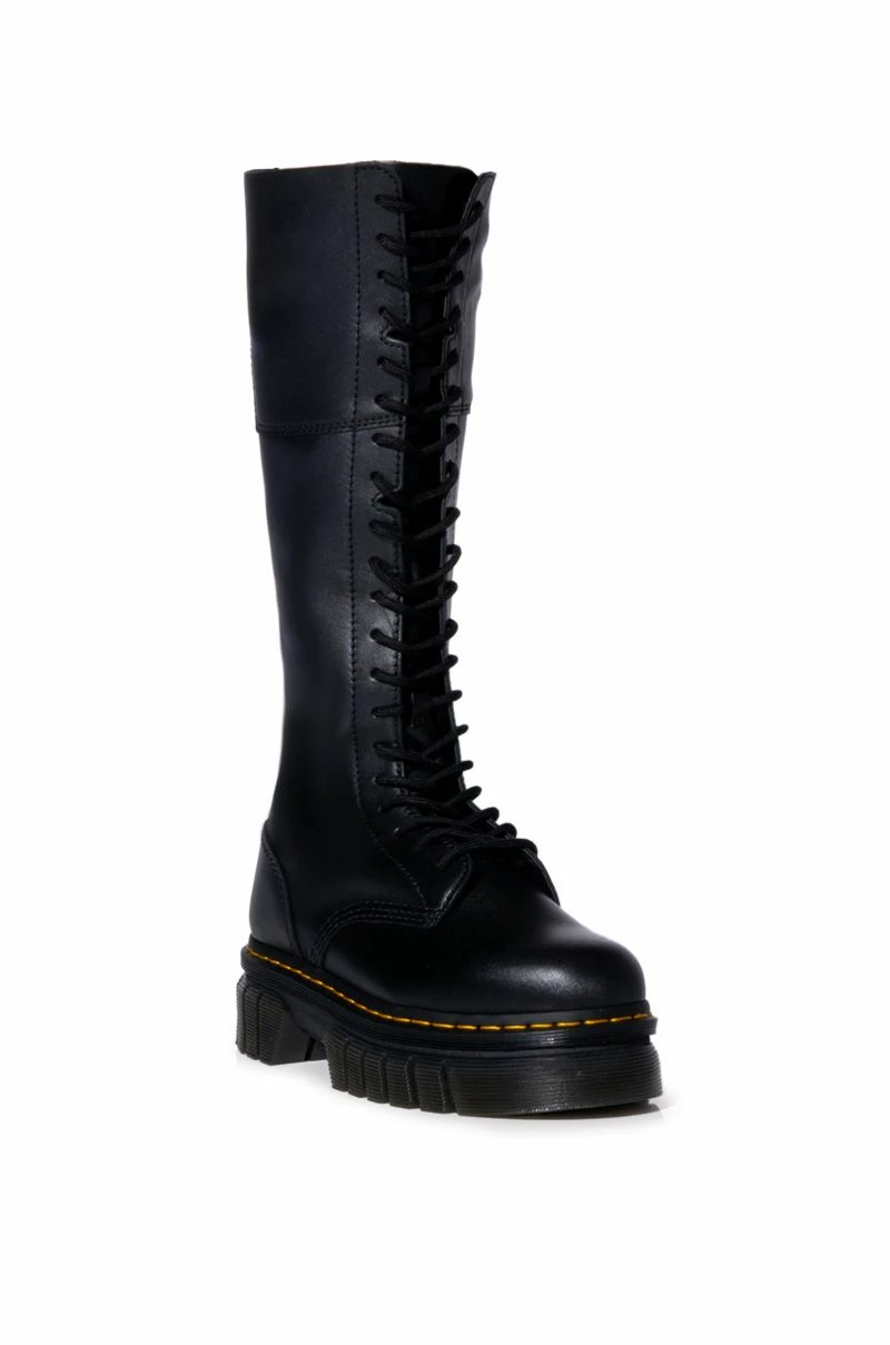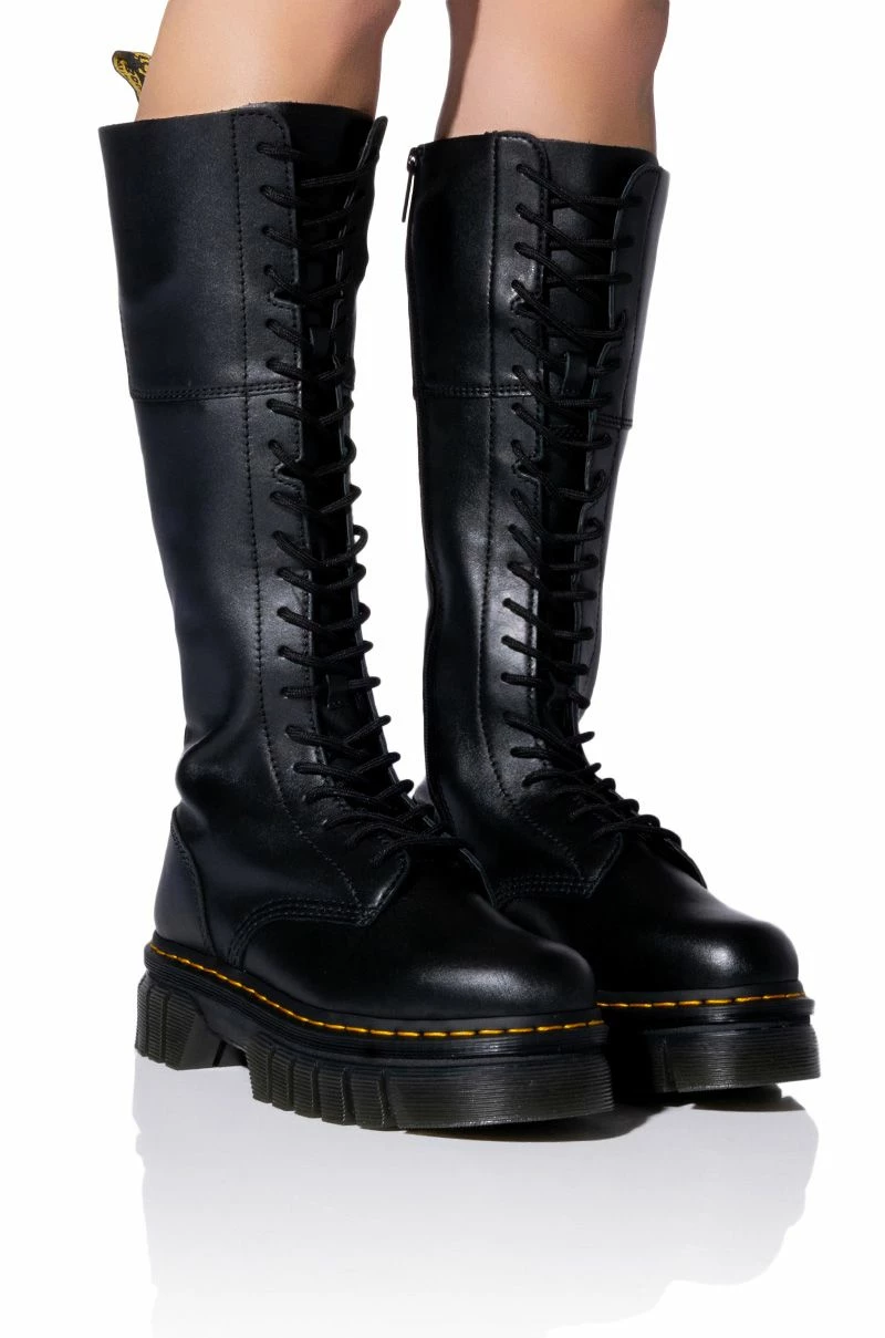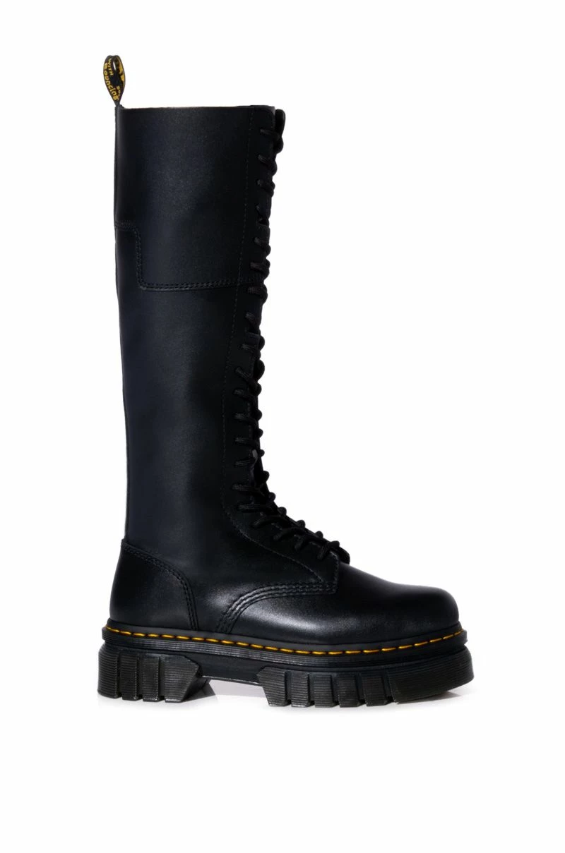 This Dr. Martens Audrick 20 Boot features a quality polished genuine leather upper and a durable bouncing rubber sole. Complete with a rounded toe, 20 eyelets, an inner zipper closure, classic yellow-embroidered contrast stitching, and a pull ankle tab. Pair with distressed denim skirt and a moto jacket for a classic look.