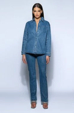 Who knew looking flawless could be so easy with The AKIRA Label Effortless Glam Rhinestone Stripe Wide Leg Jean? These pants are made from a denim fabrication and feature an allover striped rhinestone studded design, a high rise waist, belt loops, wide pant legs, and a button and zipper closure. Pair with the matching The AKIRA Label Effortless Glam Rhinestone Stripe Button Down Shirt to complete your glam’d up look!