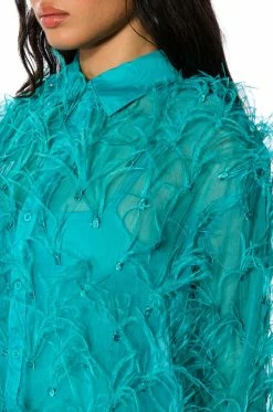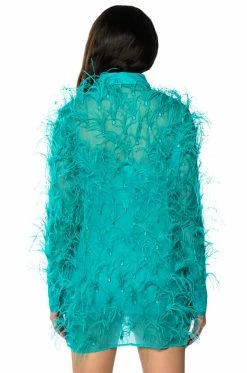The AKIRA Label The Moment Feather Detail Shirt Dress features a slightly sheer organza fabrication, a fold over point collar, long sleeves, button cuff detailing, and a classic button up front placket closure. Complete with voluminous real feather trim and an inner smooth, stretchy bodycon mini dress . Wear this piece with pointy toe pumps for a complete look.