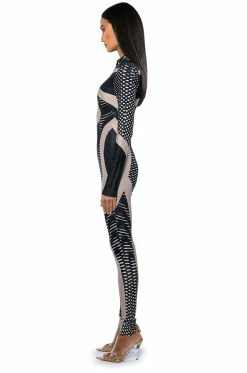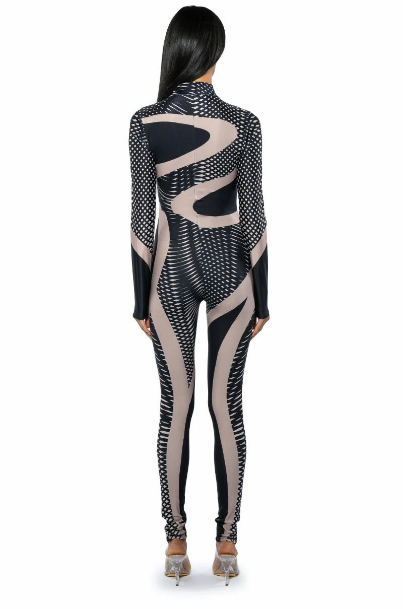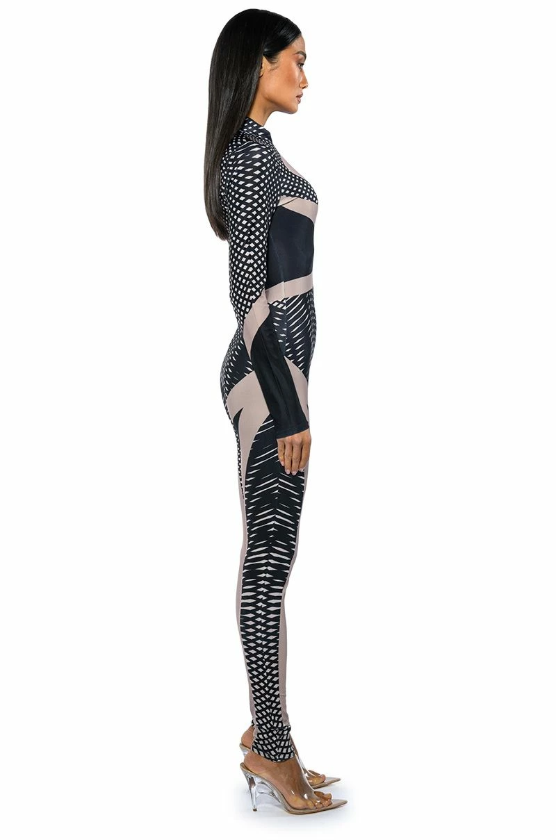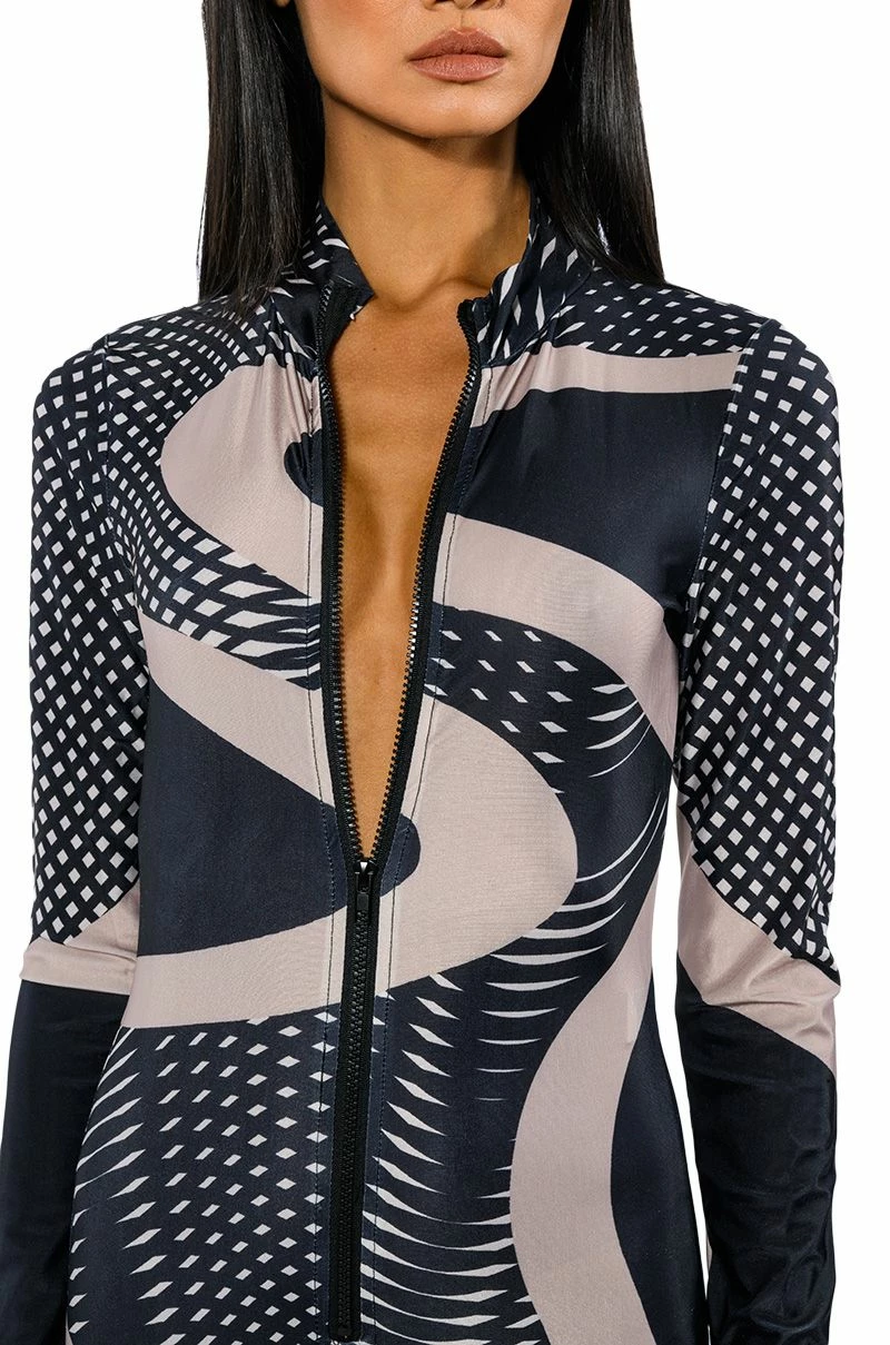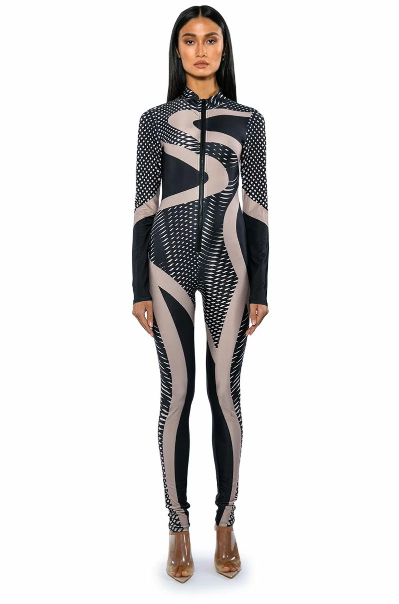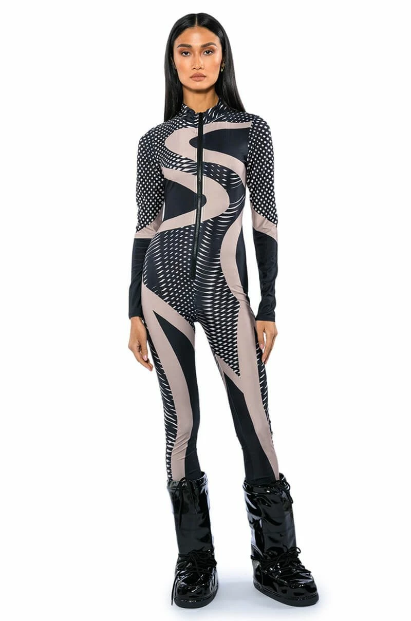 Any occasion calls for The AKIRA Label Every Event Patterned Catsuit. This sleek piece features a smooth, stretchy bodycon fabrication, a mock neckline, an abstract, and a swirled geometric print pattern. Complete with an exposed front zipper closure, long sleeves, and a skinny leg silhouette. Pair with a jean jacket and knee high boots for a go-anywhere ensemble.