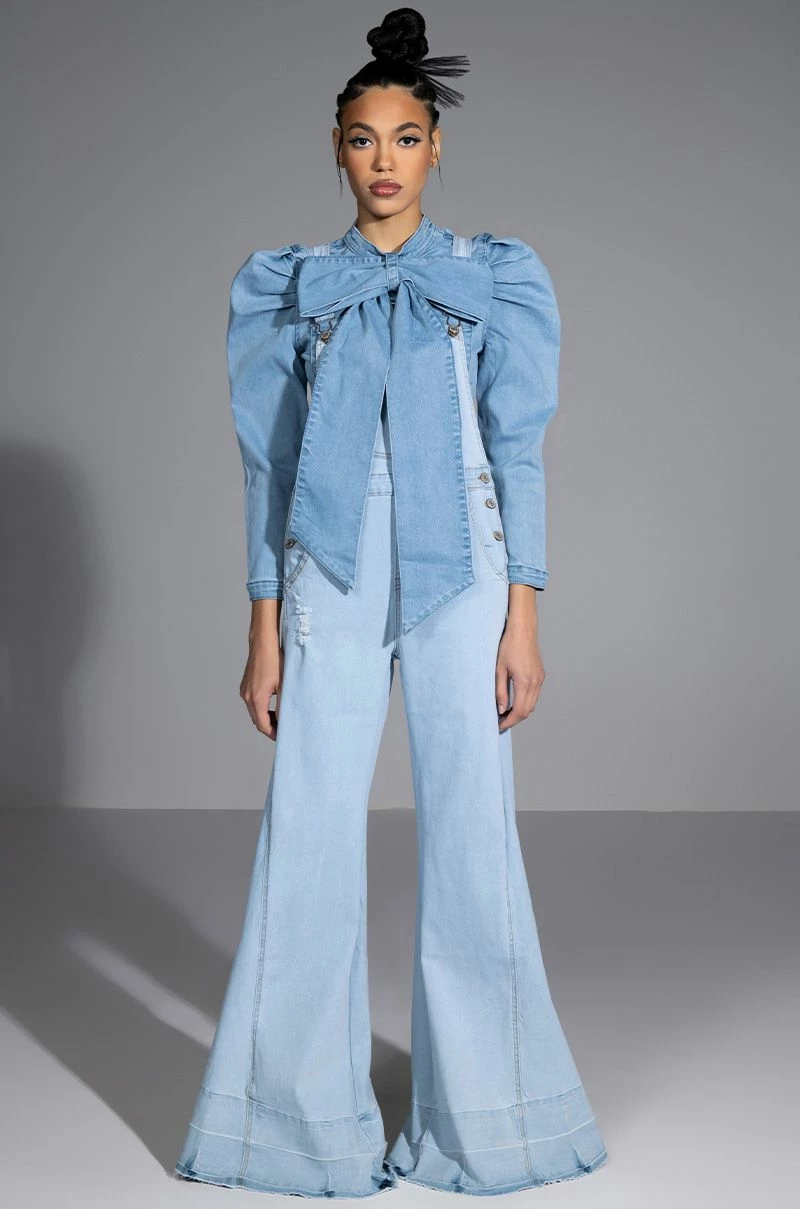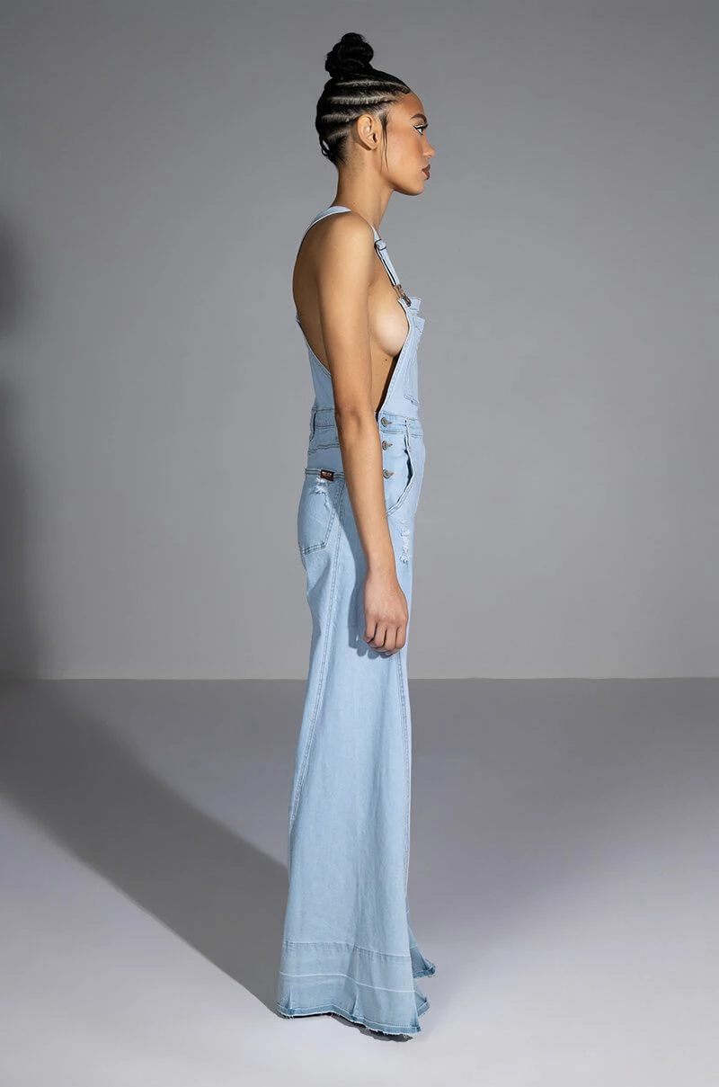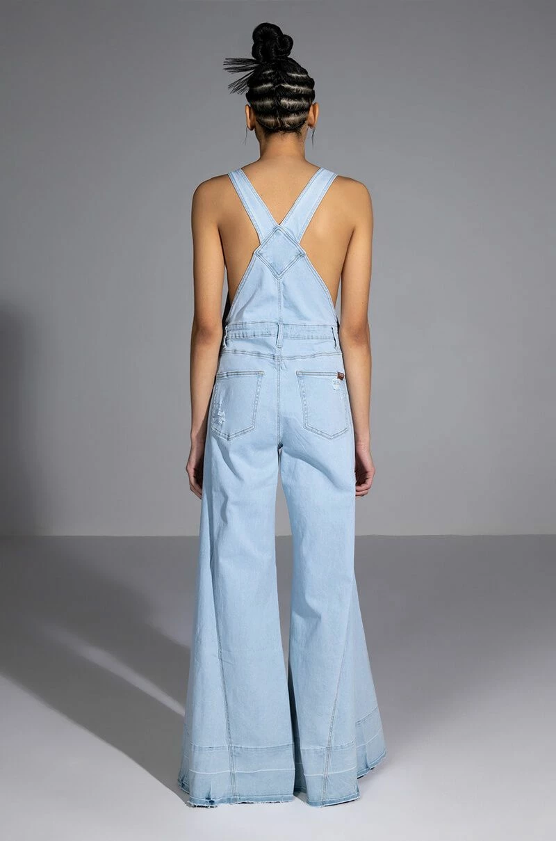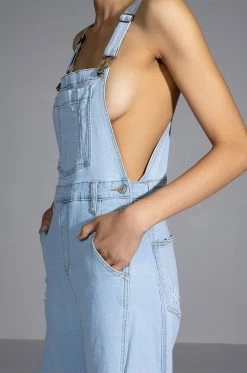 The Everyday Wide Leg Overalls are made from a washed denim fabrication and feature a classic pinafore design, adjustable buckled bib straps, a large bib pocket, functional belt loops, button sides, slant side pockets, back pockets, a mock front zipper, wide leg fit, raw hems, and distressed detailing on the front and back pockets.
