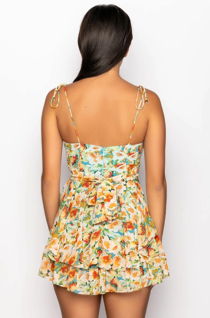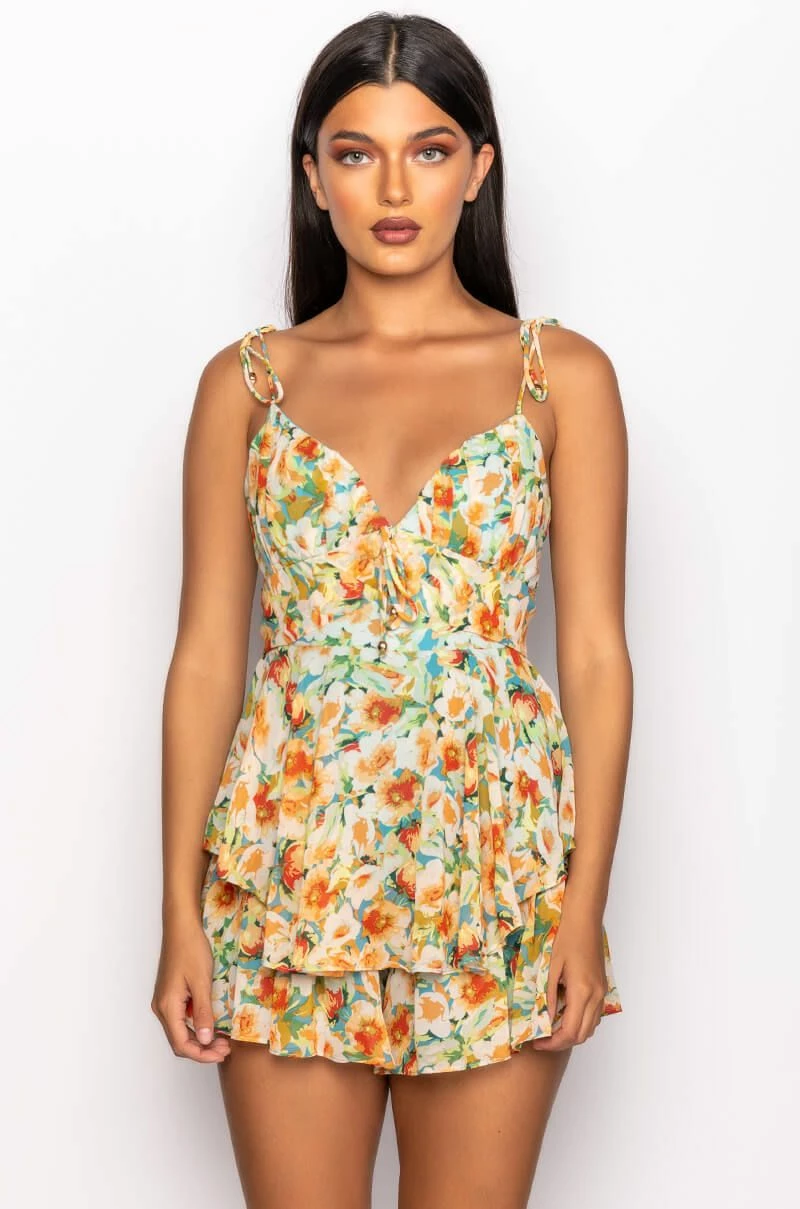 You can have it all in The AKIRA Label Everything And More Floral Romper! This sweet, romantic piece is made from a flowy fabrication and features a multicolor floral print, tie spaghetti straps with beads, a plunge neckline with pleated cups and a beaded tie detail, a thick cross front waistband with tie, a layered ruffle chiffon overlay, inner shorts, and a tonal back zipper closure.
