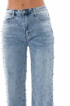 A pair of jeans fit for every occasion. The AKIRA Label Everytime Rhinestone Embellished Straight Leg Jeans feature a stretch denim fabrication, a high rise waist, functional belt loops, a classic five-pocket design, a straight leg silhouette, rhinestone gemstone detailing throughout, and a button and zipper closure. Style with a sleek halter top and PVC pumps for a complete look.