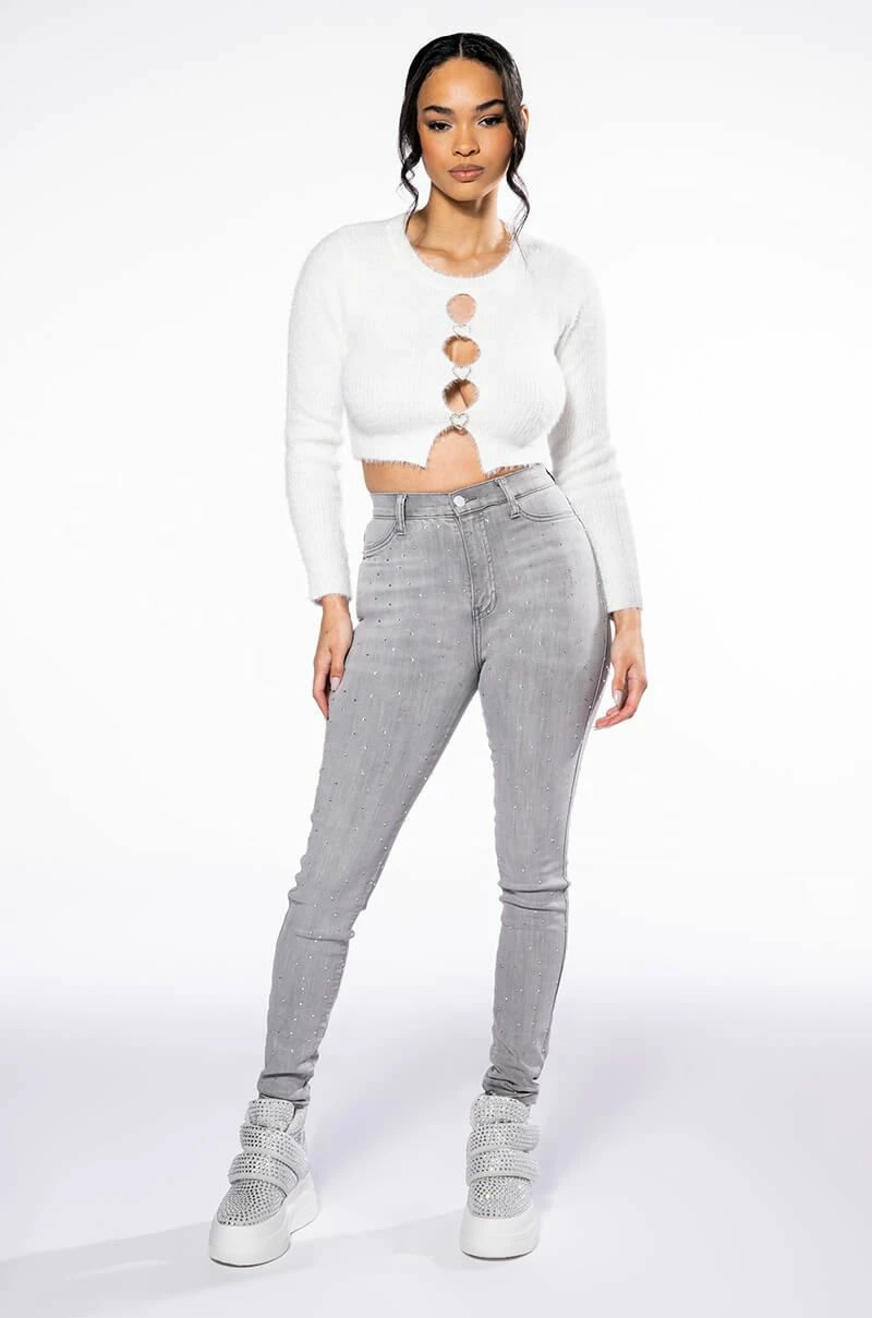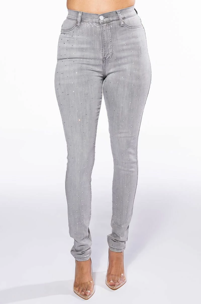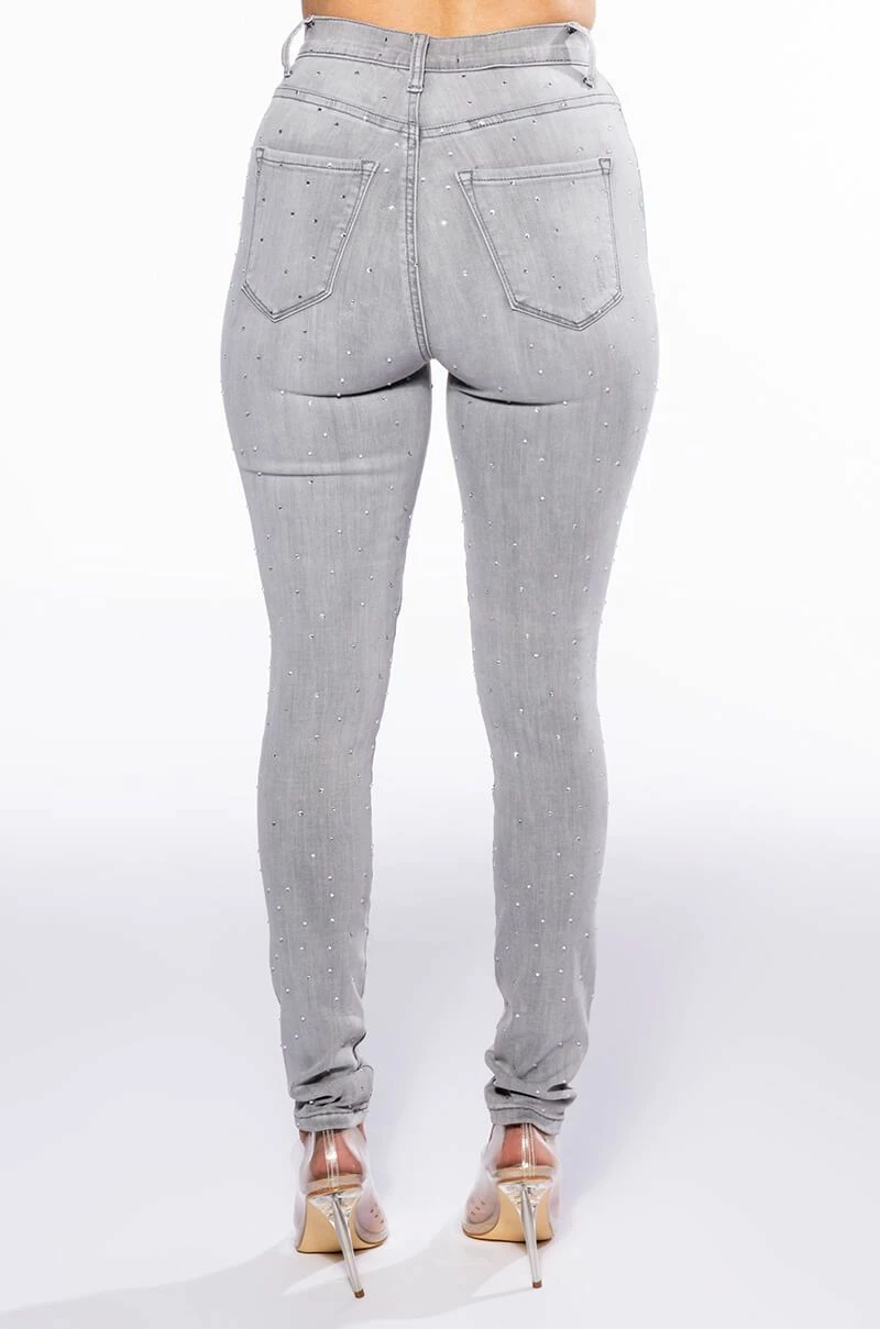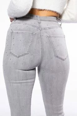 Snatch your waist and shine in The AKIRA Label Extreme Stretch High Waisted Skinny Jeans With Rhinestones in Grey. These ultra-stretchy denim bottoms feature a curve-hugging stretch knit construction, a high rise waist, a classic zip button closure, allover rhinestone detailing, and a skinny leg fit. Complete with mock front pockets, working back pockets, and functioning belt loops.