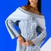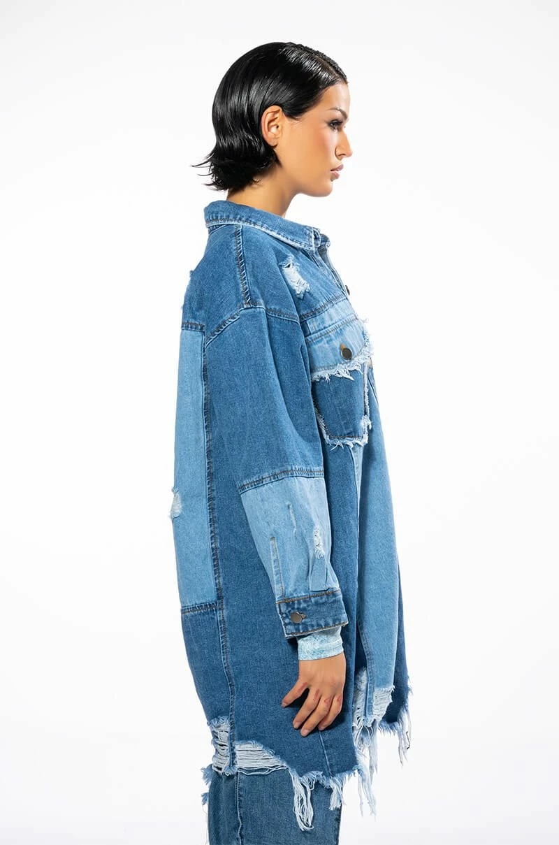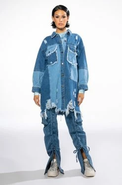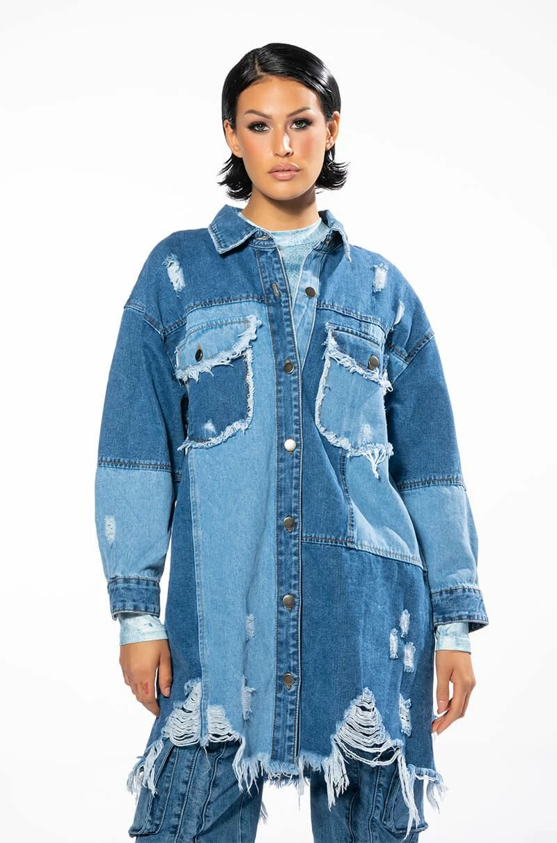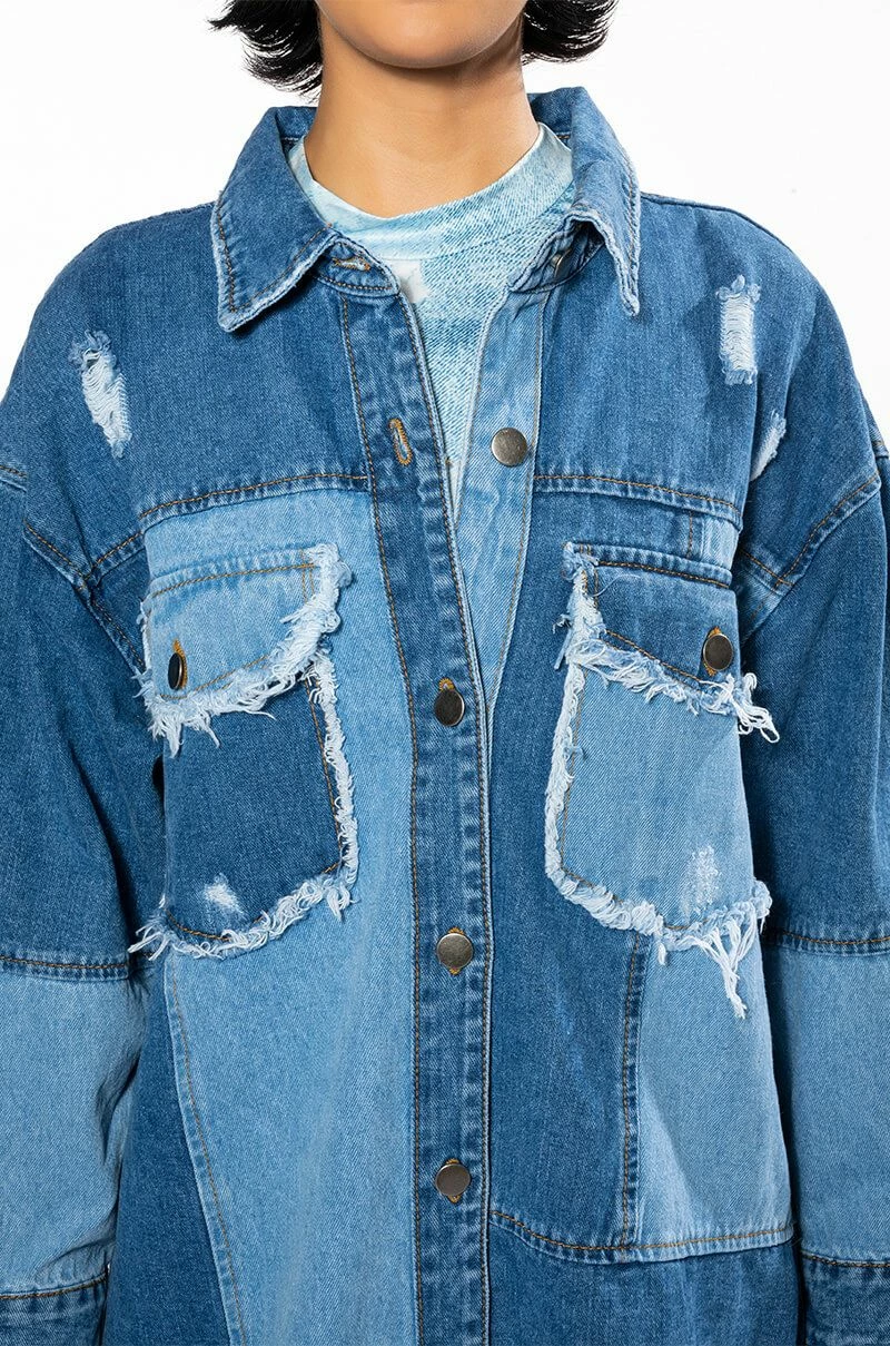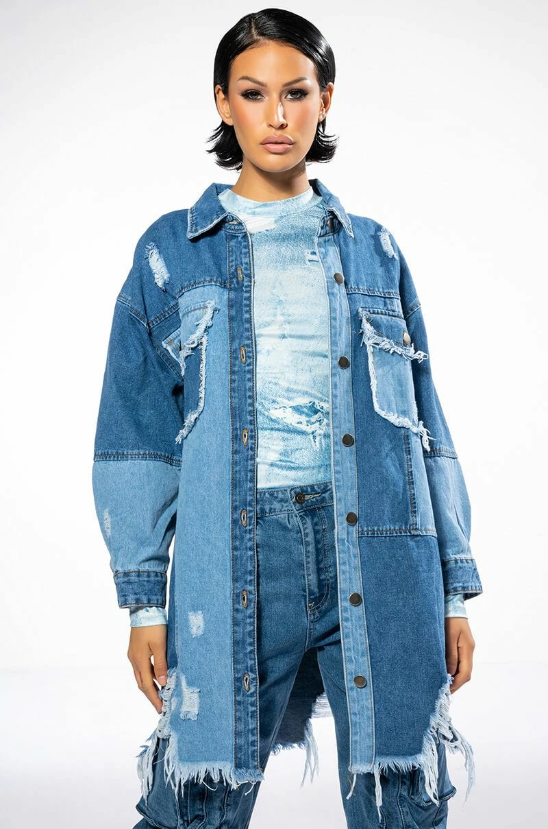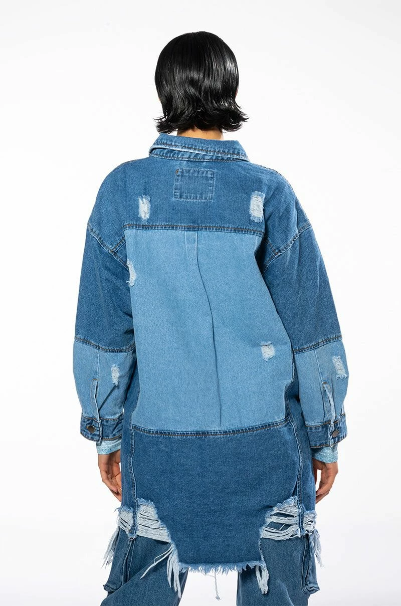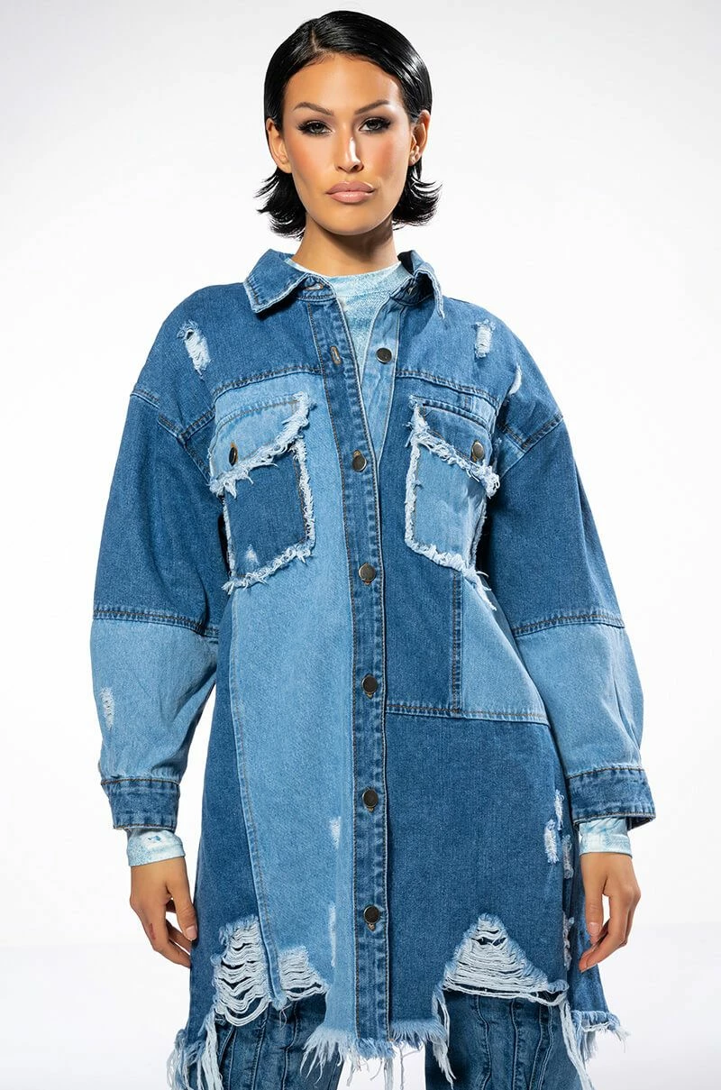 The Feeling Good Distressed Denim Mini Dress is made from a structured denim fabrication and features a collared neckline, distressed body detailing, colorblock denim paneling, long sleeves with buttoned cuffs, button chest pockets, and a mini length silhouette. Complete with a button down front closure.