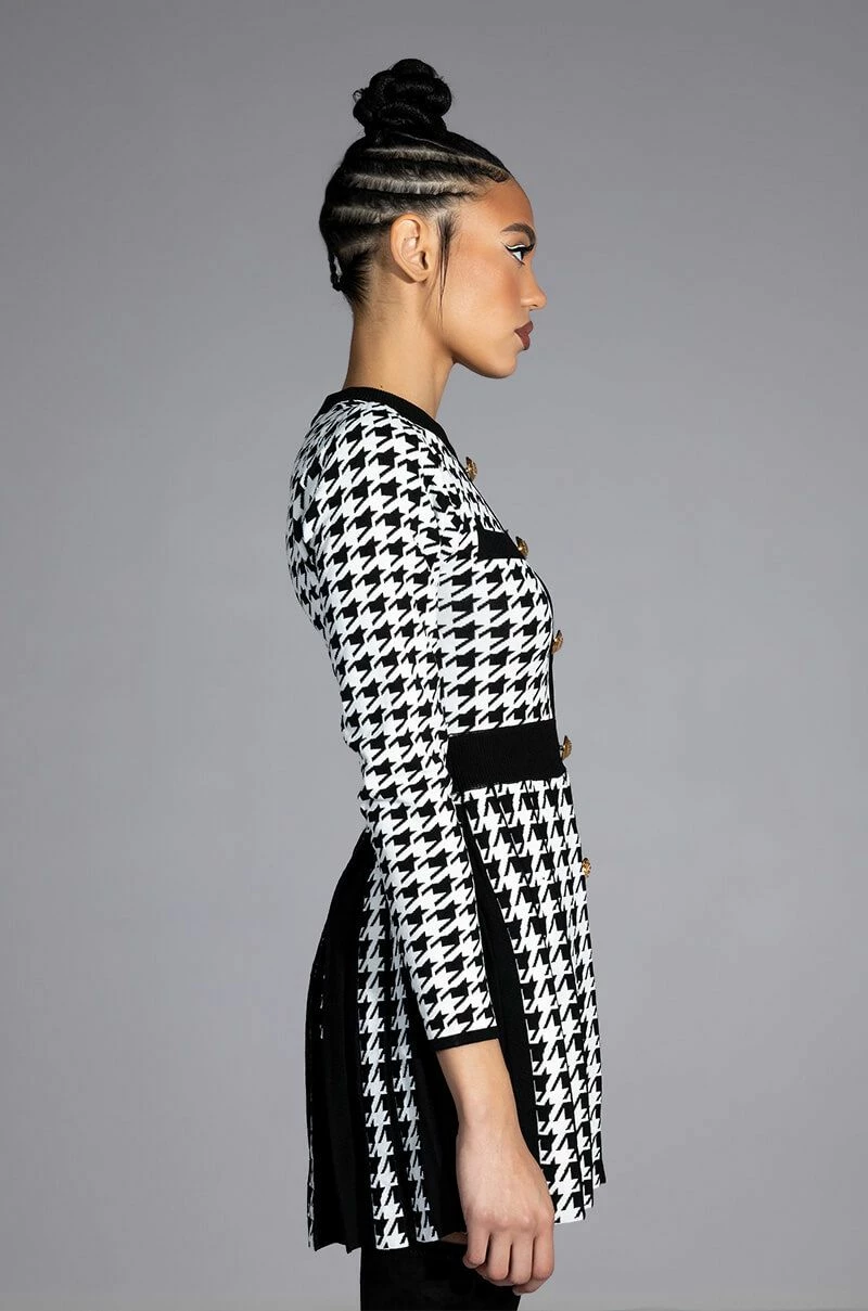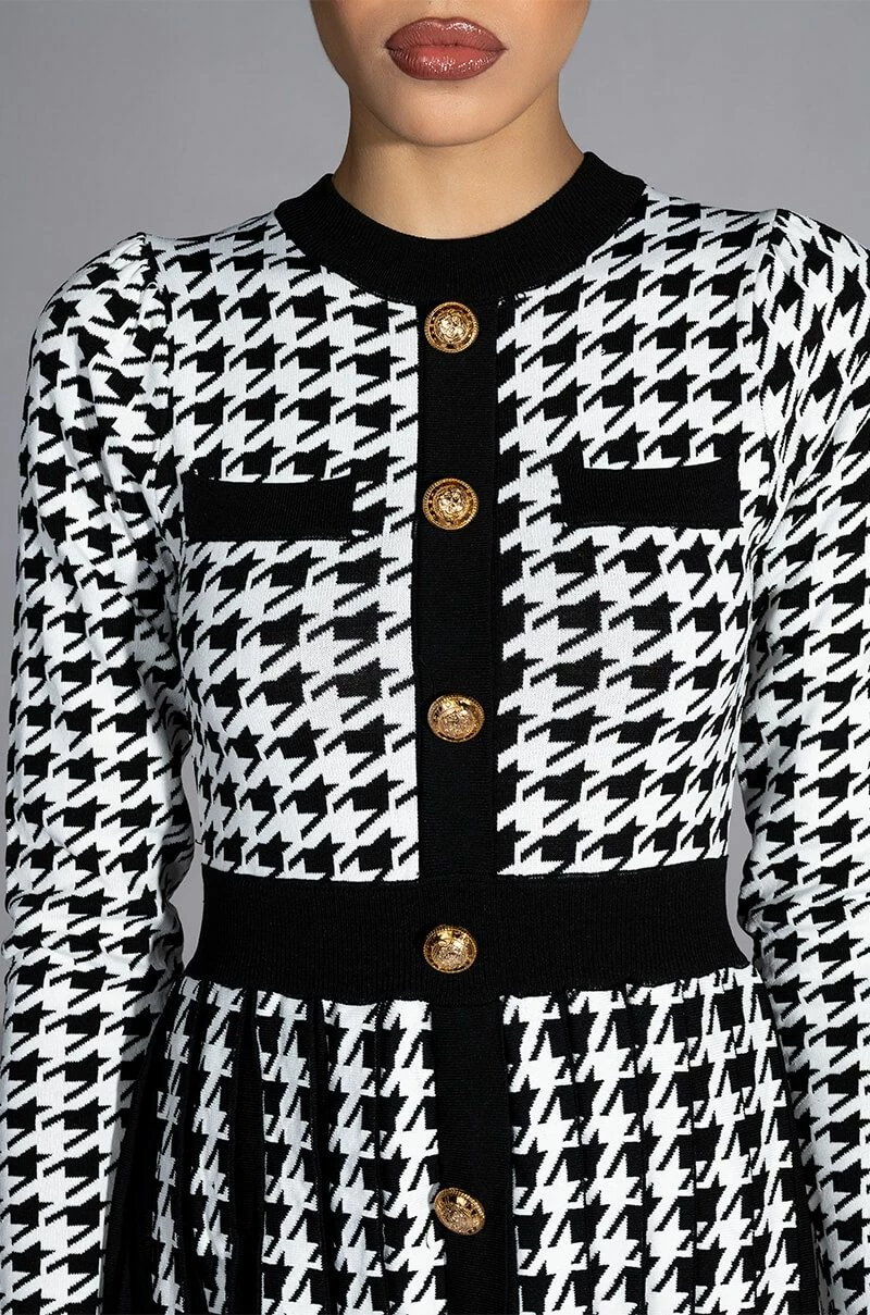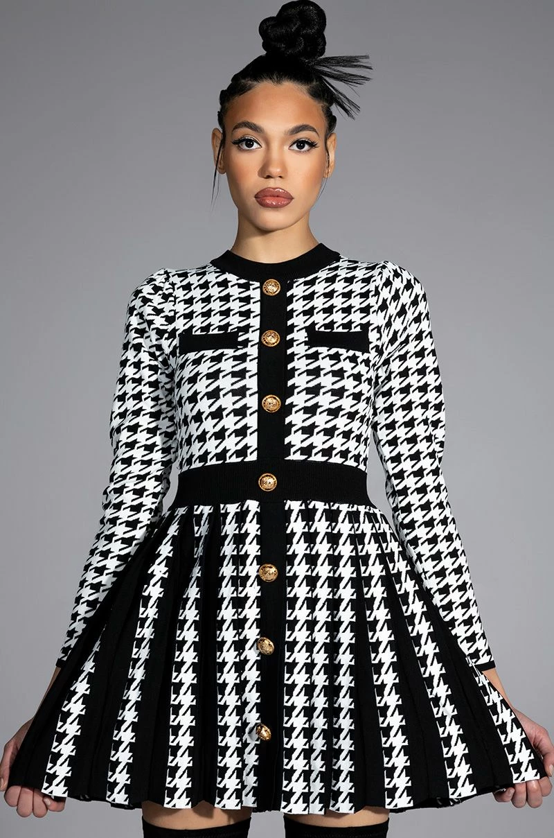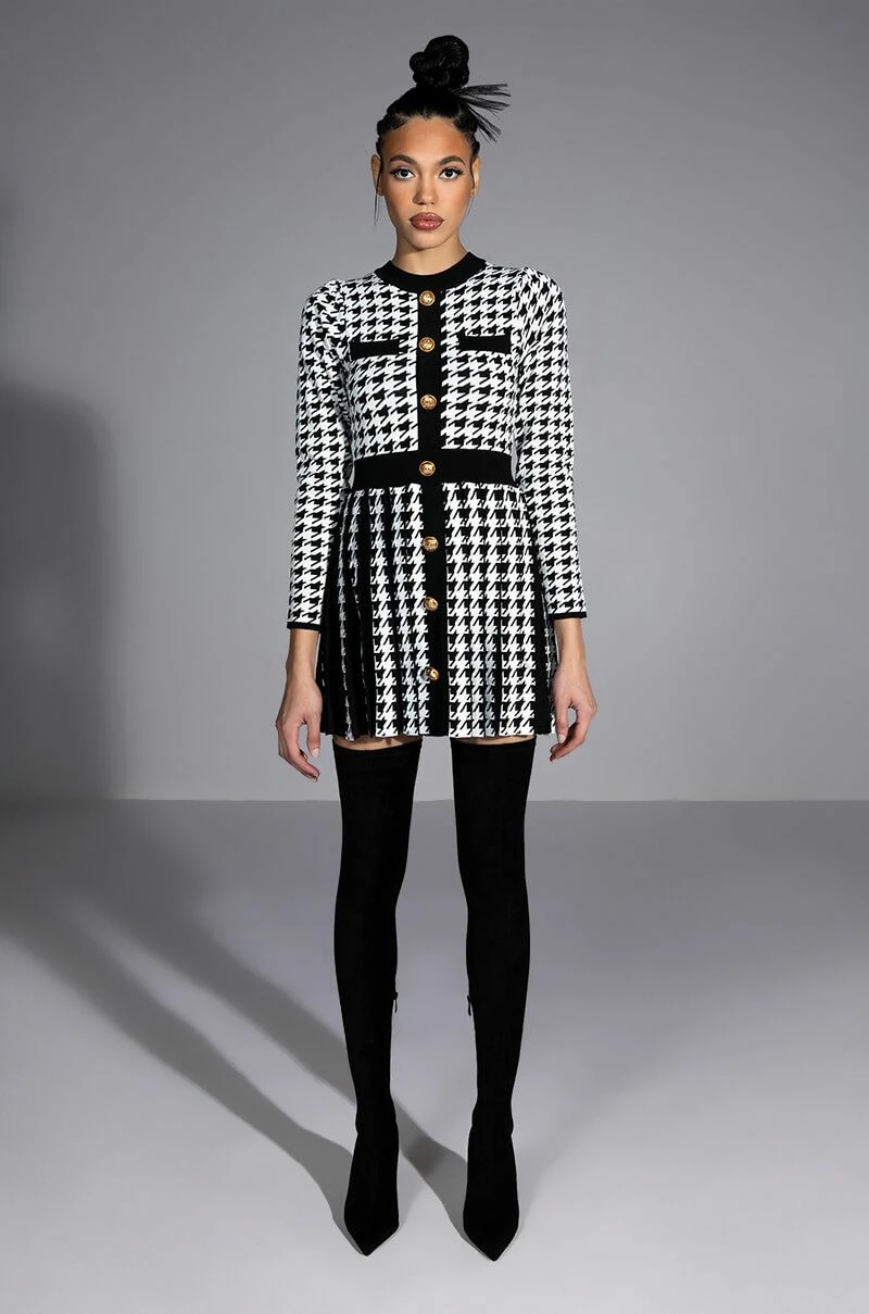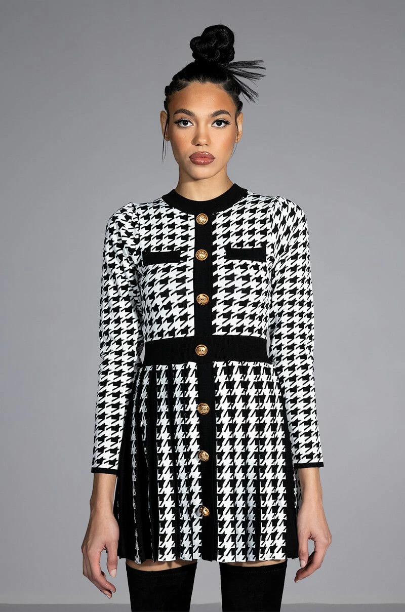 The AKIRA Label Fit To Print Knit Pleated Skirt Mini Dress features a knit fabrication, a crewneck silhouette, long sleeves, subtle puff shoulder detailing, a mini length, a pleated skirt, and a slip-on fit. Complete with ribbed knit trim, faux chest pockets, a cinched elastic waistband, faux gold button front detailing, and woven houndstooth print patterning throughout. Pair this piece with thigh high boots to complete your look.