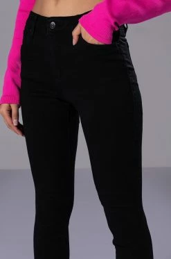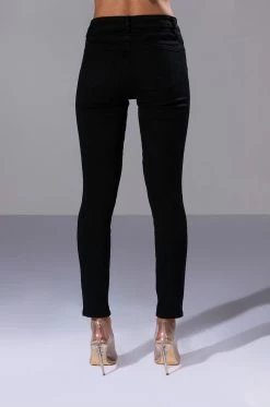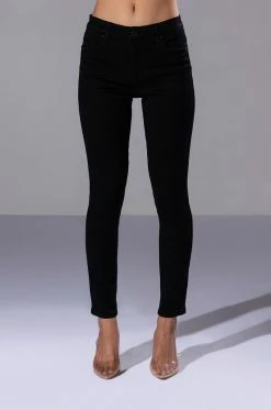 The AKIRA Label Flex Fit Extreme Stretch High Waisted Skinny Jeans are an updated take on the classic pencil pants rendered in a high waisted, curve hugging, ankle length silhouette. Complete with working back pockets, a zipper fly button fasten, and an extreme stretch fit for extra comfortability. Style with a snug graphic tee for a casual look or try a peplum blouse for an elevated take.