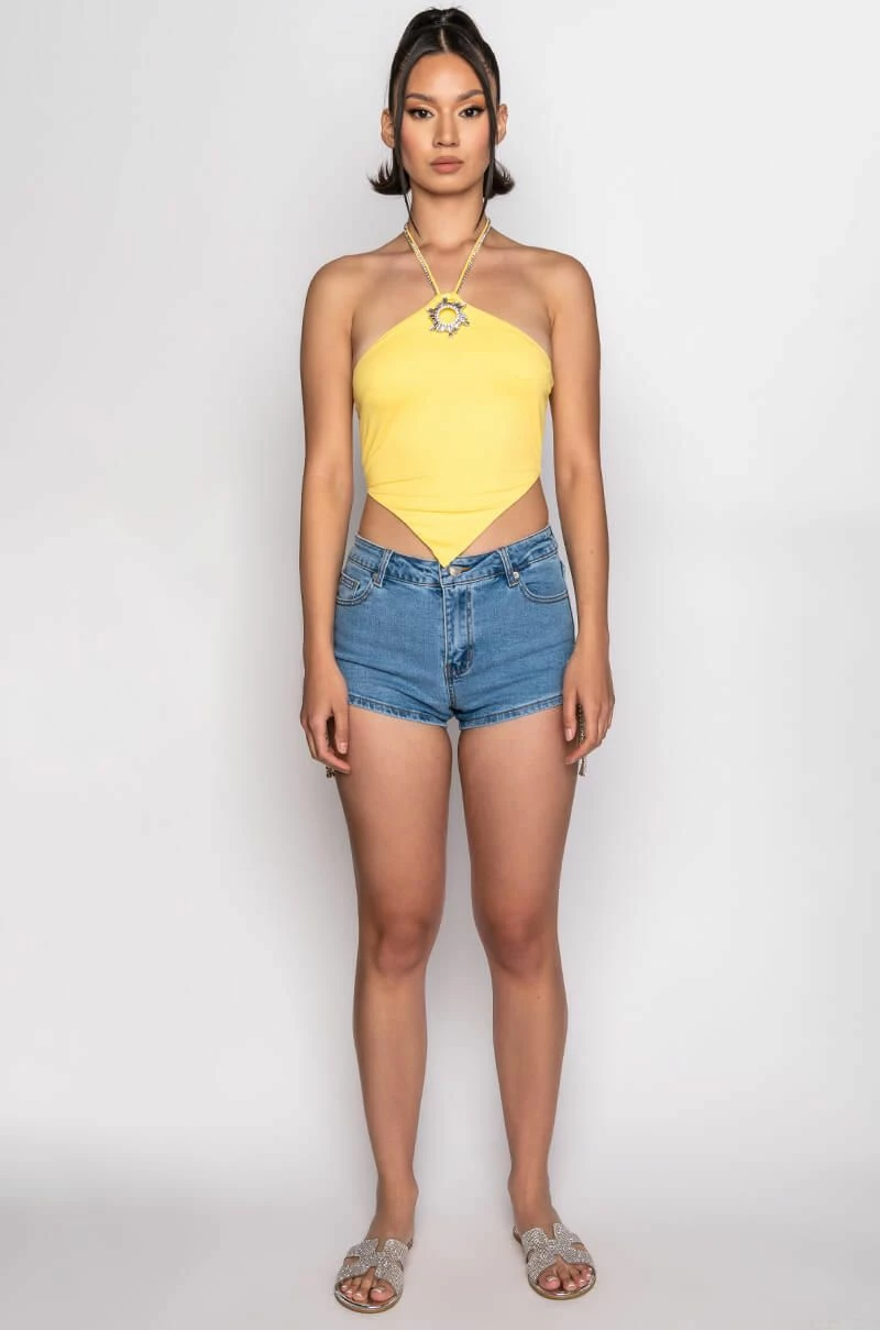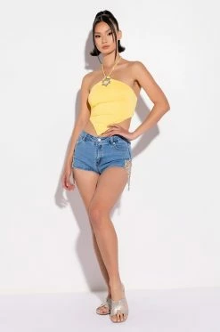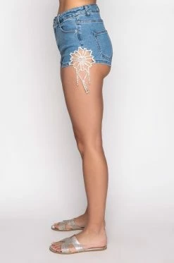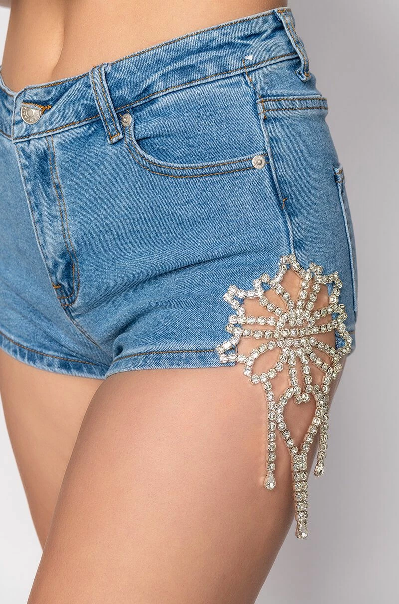 The AKIRA Label Florence Rhinestone Cut Out Denim Short is a high rise, ultra-glam denim short complete with a cut out side detailing, rhinestone link floral accents, rhinestone link fringe, a functional five pocket design, medium wash hue, and a zipper fly button-loop closure. Style with a bat wing bodysuit and strappy stiletto sandals.