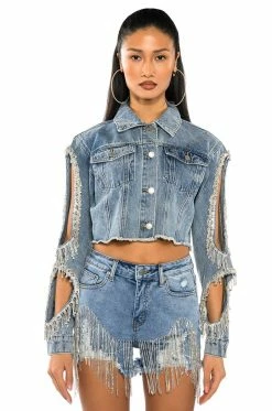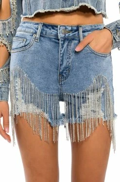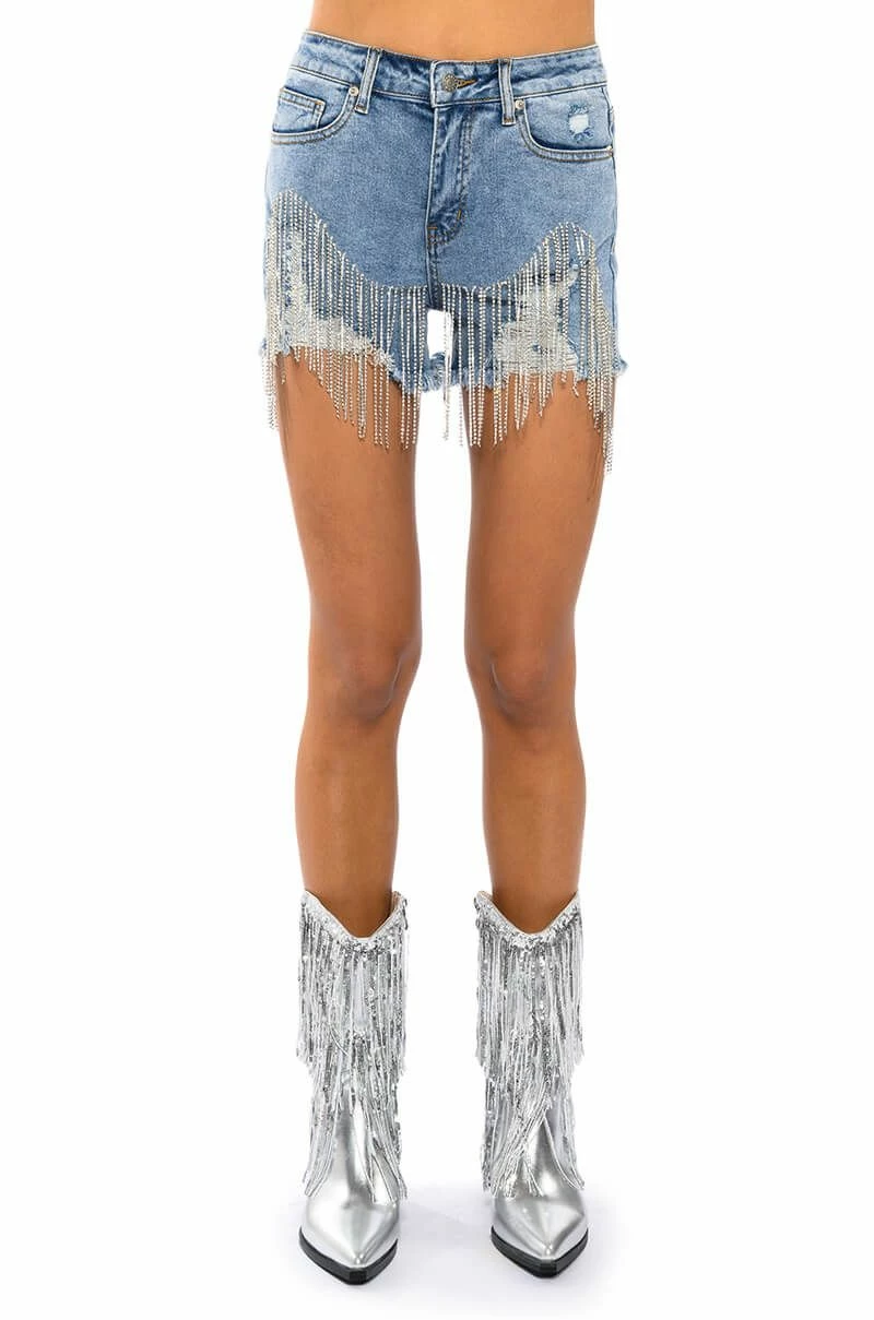 You love it, then come and get it. Time to add The Akira Label Fresh Out The Runway Rhinestone Denim Short to your cart. These slightly stretchy denim shorts feature a high rise waist, four pocket design, belt loops, zipper fly button fastening, slight distressed details, raw hems, and glam rhinestone fringe trimming. Style with a rhinestone bra top for the full bad gal effect.