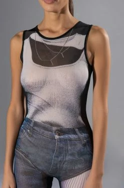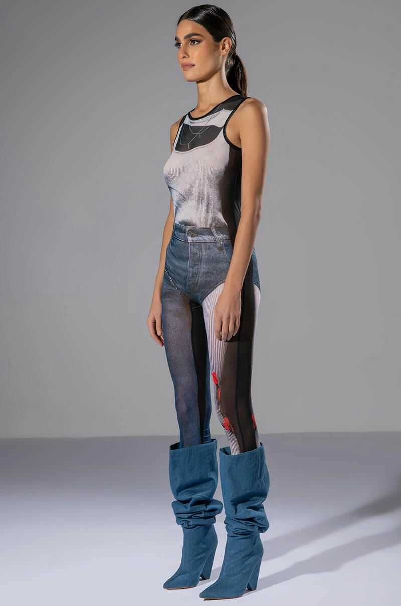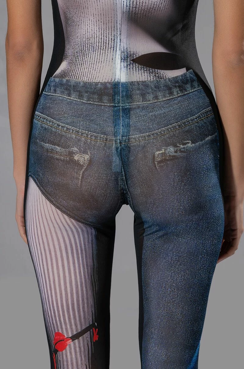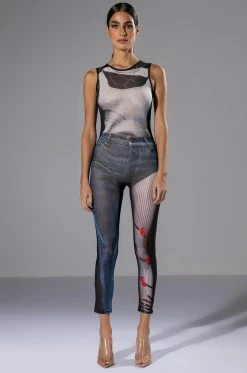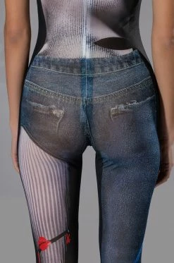 The AKIRA Label Ghosting You Sleeveless Catsuit is a printed sheer mesh jumpsuit featuring a sleeveless silhouette, a scoop neckline, attached skinny leg pants, and a sexy bodycon fit. Complete with a concealed back zipper closure and tromp l’oeil single leg denim and stripe print patterning across the front and back. Style this piece under a jean jacket for a layered look.