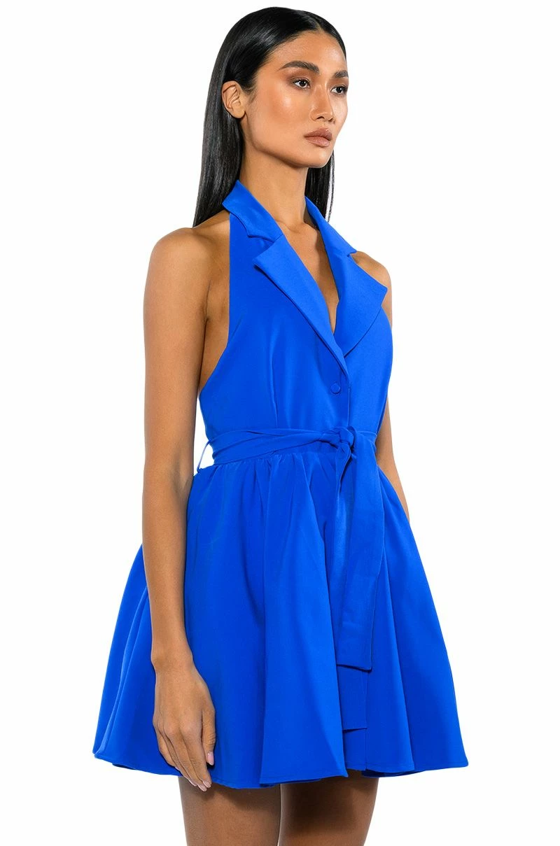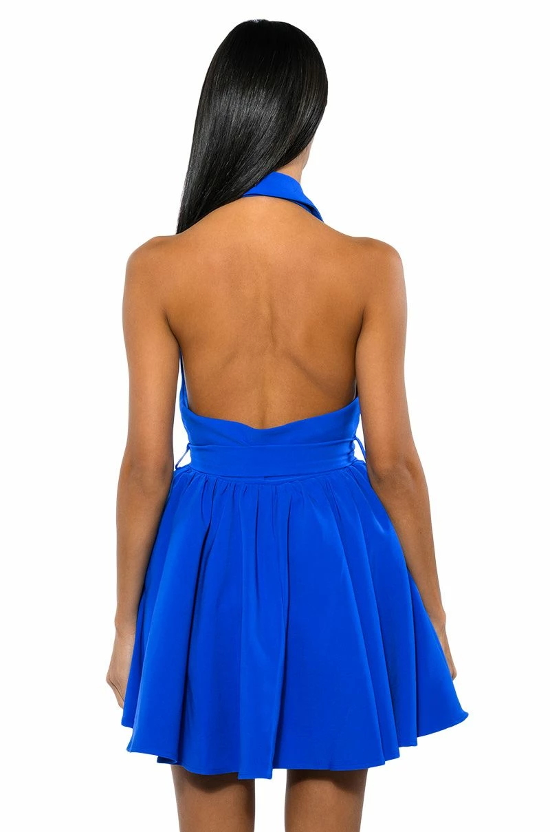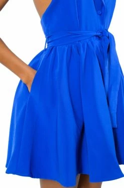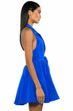 The AKIRA Label Hadley Collared Fit And Flare Mini Dress In Royal Blue is made from a structured fabrication and features a collared halter neckline, a sleeveless design, princess seam detailing, a tie waist, a flared skirt, side pockets, satiny, reinforced lining, and a mini length silhouette. Complete with a button down front closure.