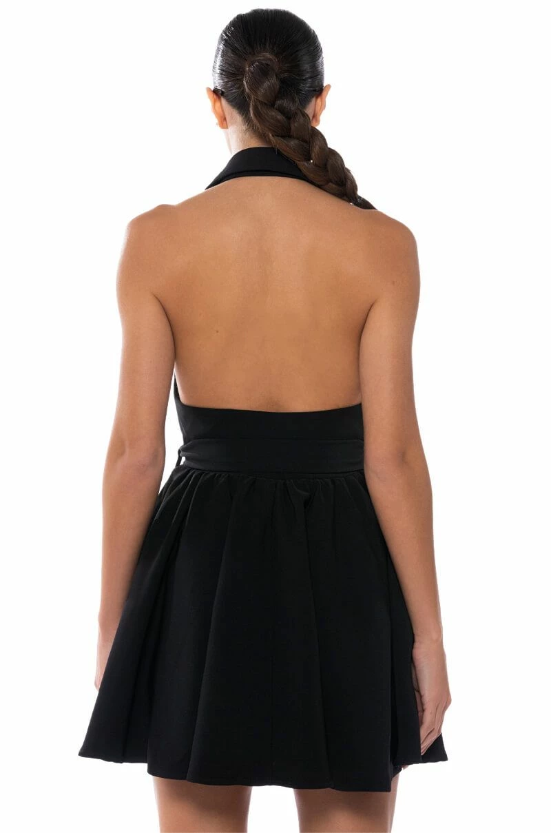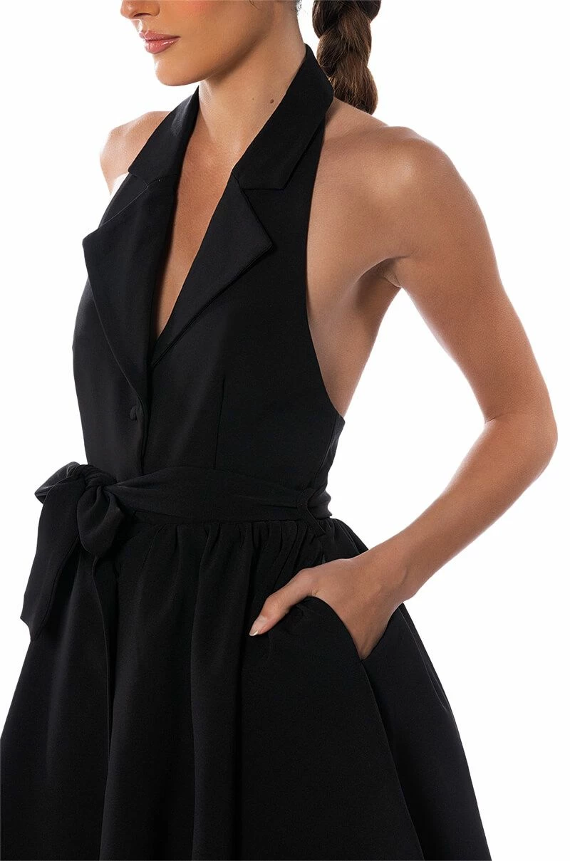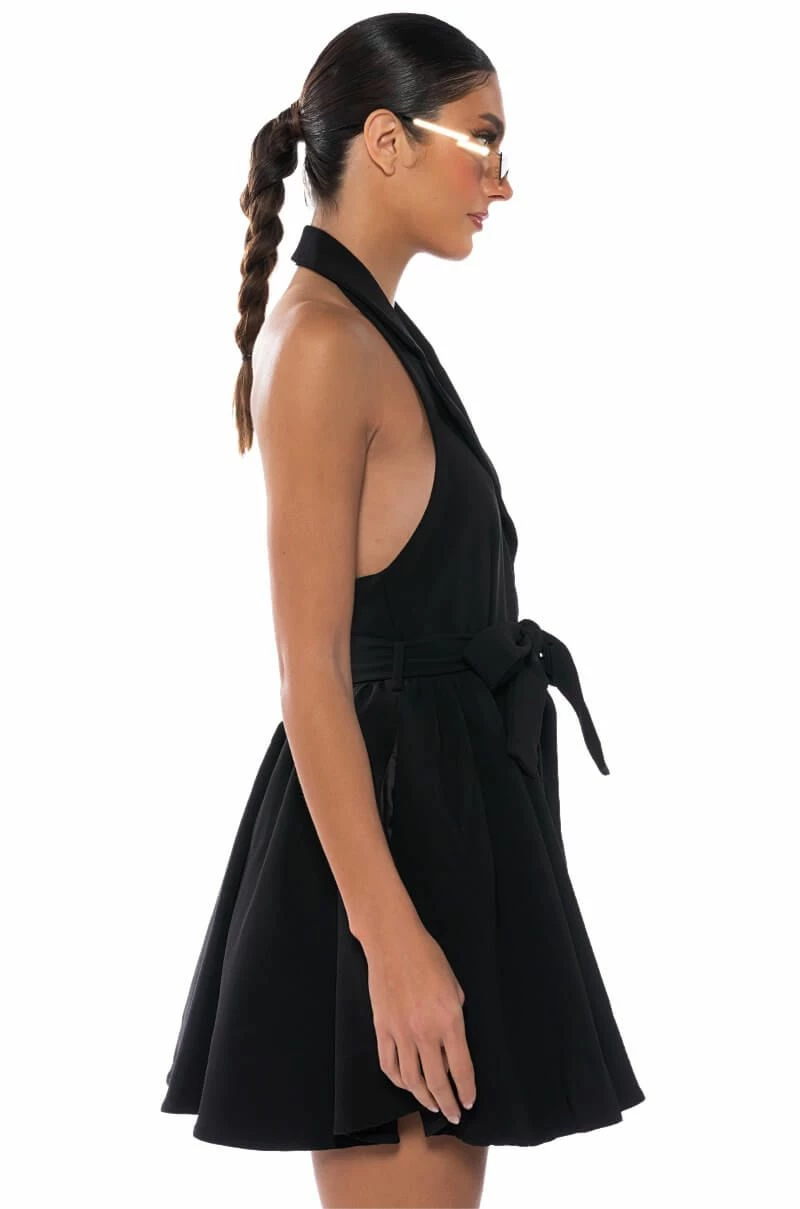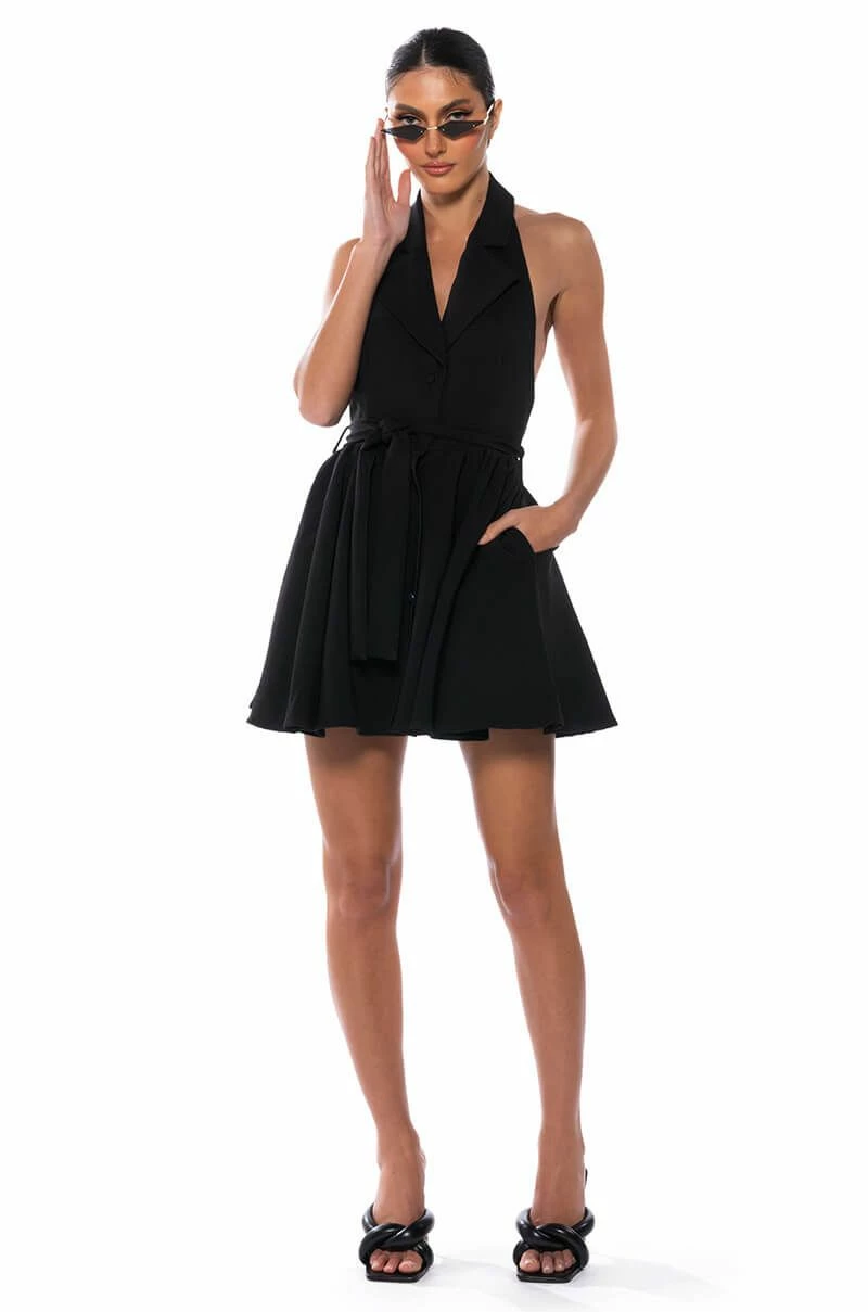 The AKIRA Label Hadley Collared Fit And Flare Mini Dress is made from a structured fabrication and features a collared halter neckline, a sleeveless design, princess seam detailing, a tie waist, a flared skirt, side pockets, satiny, reinforced lining, and a mini length silhouette. Complete with a button down front closure.