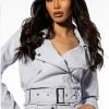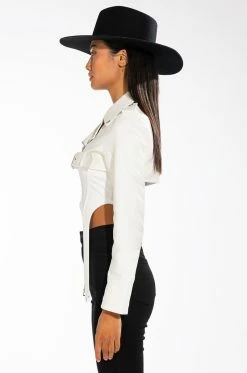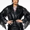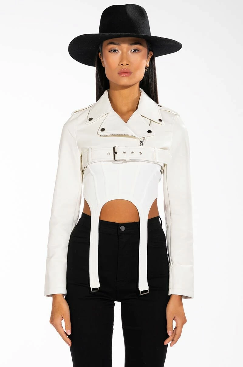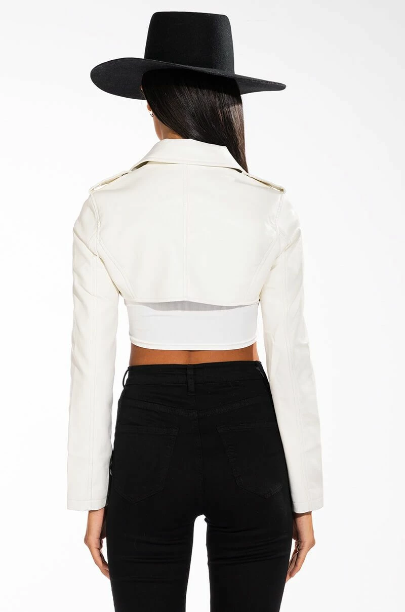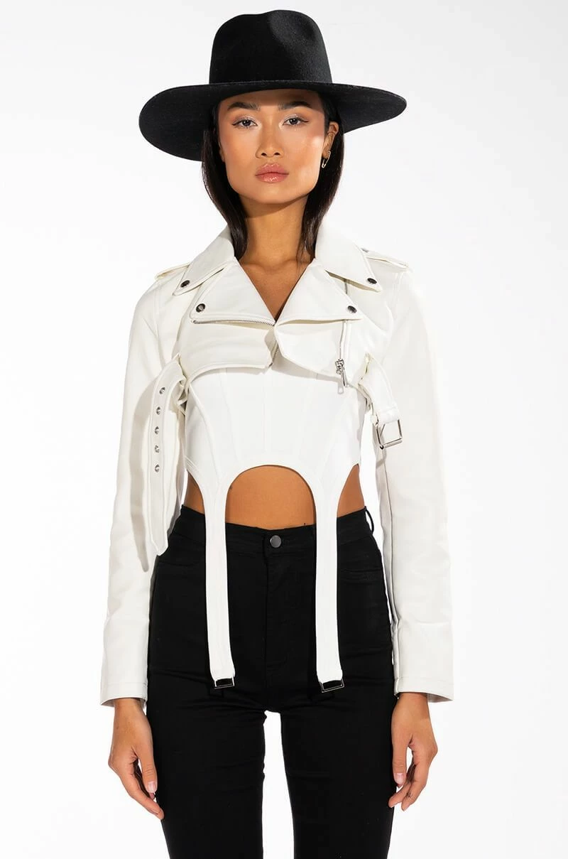 Wear your heart on your sleeve with The AKIRA Label Half My Heart Ultra Cropped Moto Jacket. This cropped layering piece is made from a soft vegan leather fabrication and features a notch collar with rounded stud detailing, shoulder epaulets, long sleeves, an ultra cropped silhouette, polyester lining, working belt loops with an adjustable vegan leather belt at the hem, and a front zipper closure.