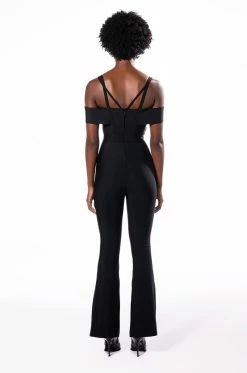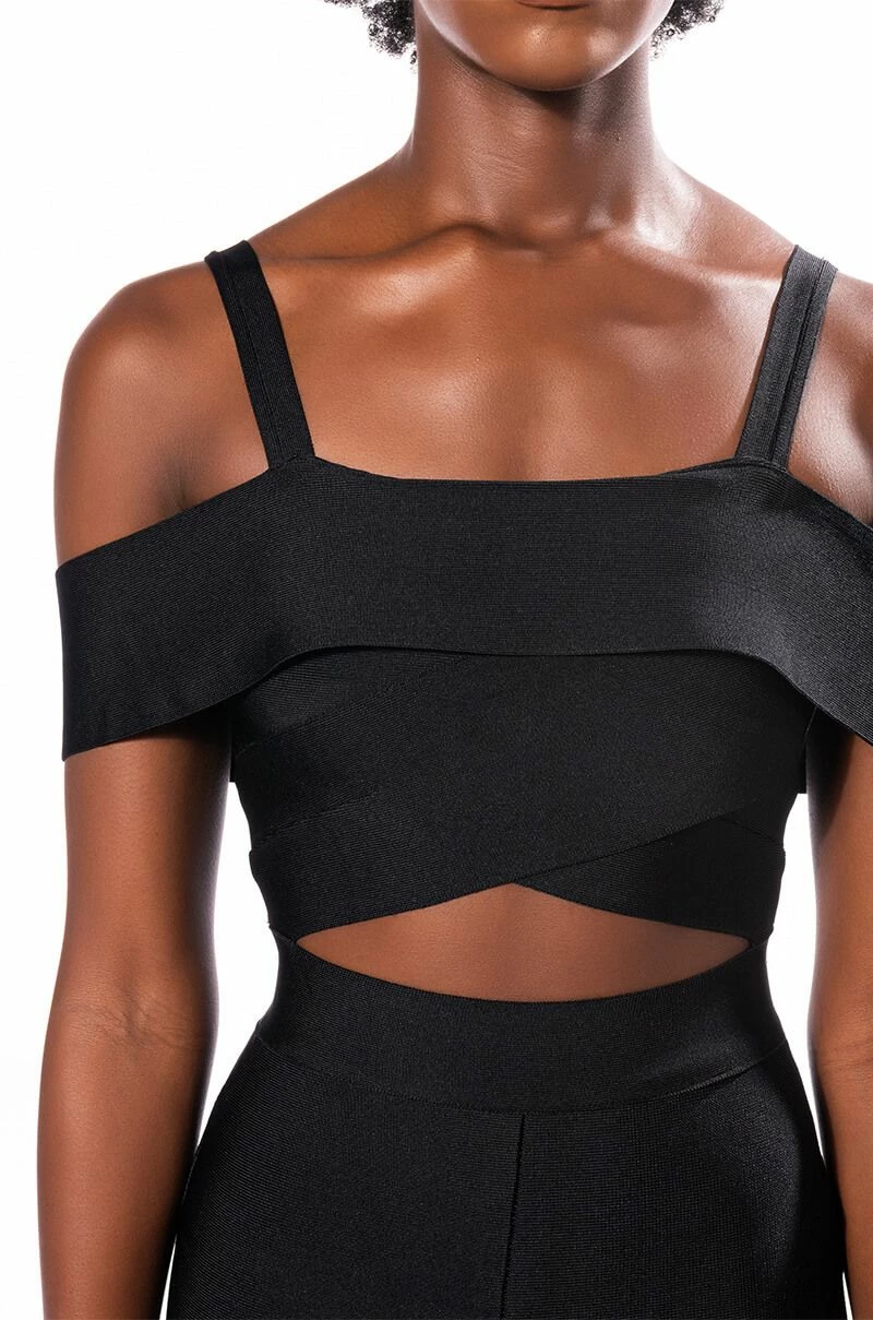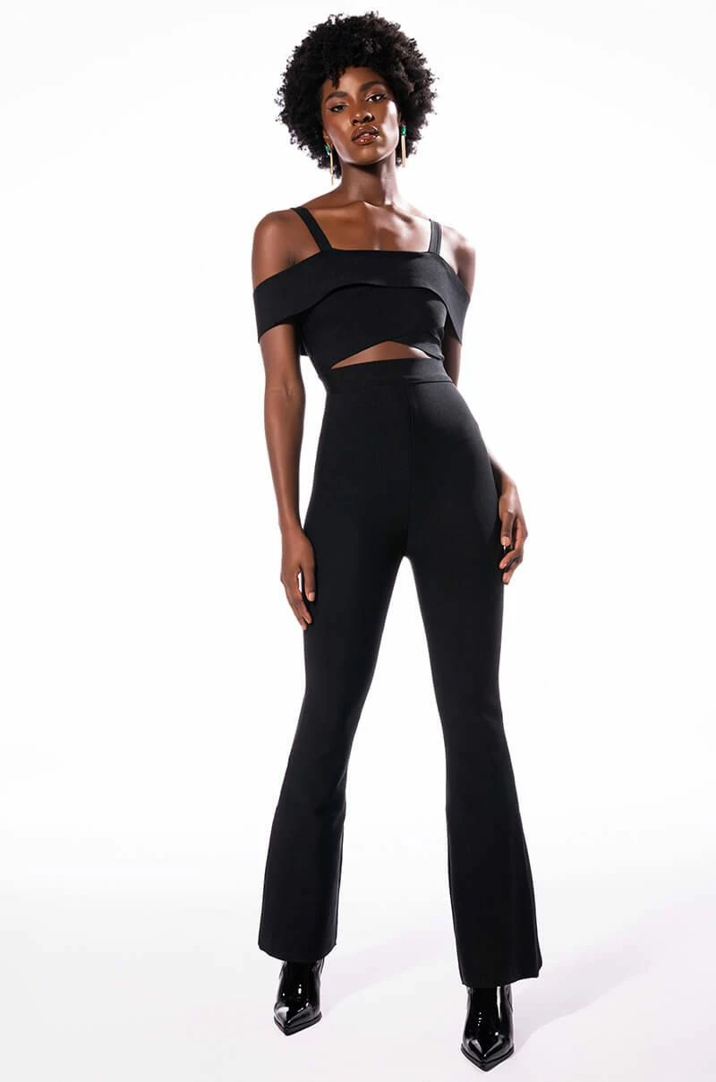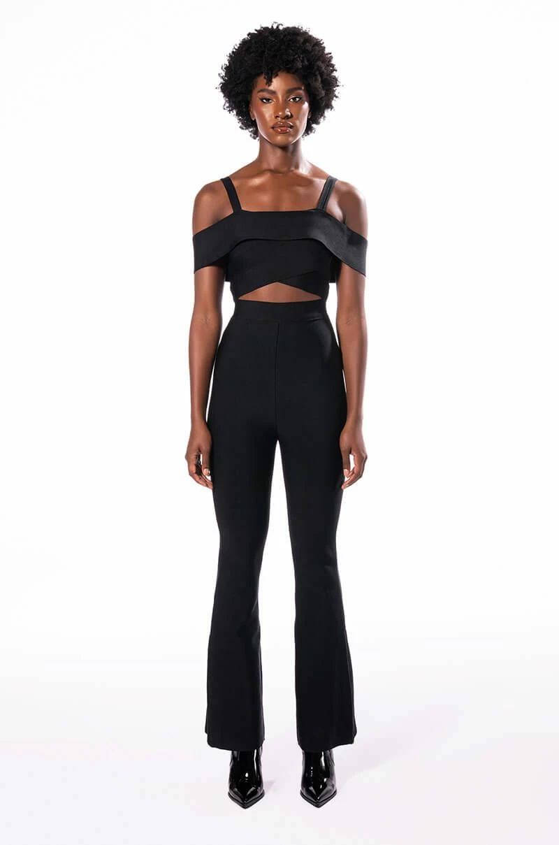 Wave to the haters in The AKIRA Label Hey There Bandage Jumpsuit With Cut Out! This sleek one piece is made from a fitted bandage fabrication and features tank straps, a straight off the shoulder neckline, a cross front bodice with a sexy chest cutout, slightly flared legs, and a strappy back. Complete with a tonal back zipper closure.