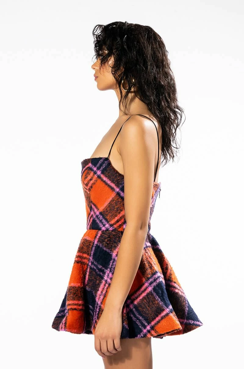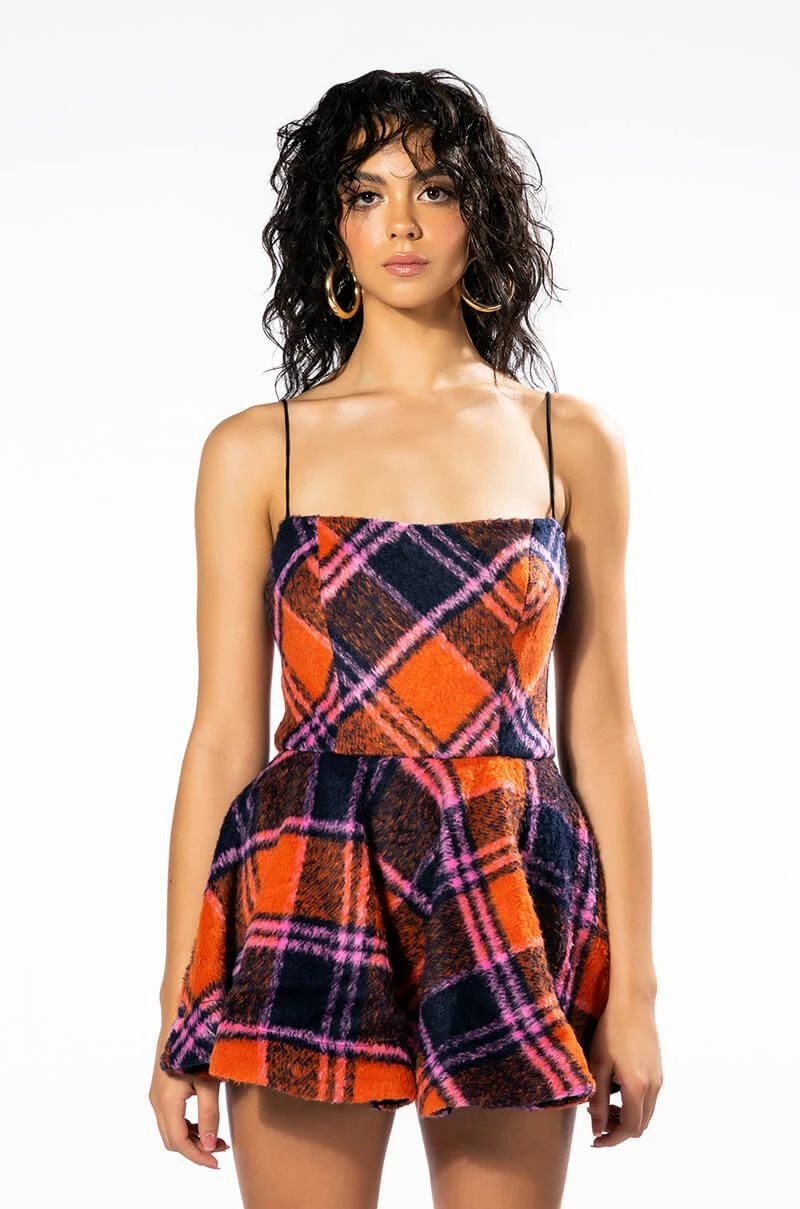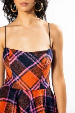 The AKIRA Label How Deep Is Your Love Fuzzy Fitted Dress features a fuzzy, flannel-inspired fabrication, plaid print patterning, a straight across neckline, slim spaghetti straps, and an exposed back zipper closure. Complete with a flared trumpet skirt, a reinforced hem, and a mini length silhouette. Pair this piece with The AKIRA Label How Deep Is Your Love Fuzzy Crop Shacket, tights and platform pumps to finish off your flirty look.
