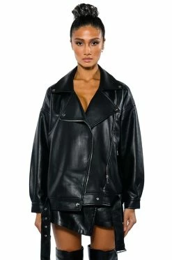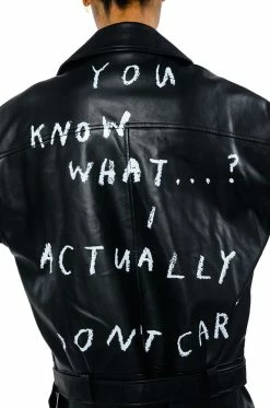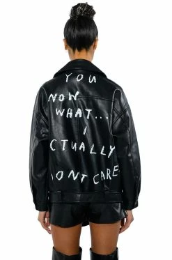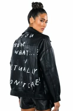 Tell ‘em how you really feel with The AKIRA Label I Actually Do Not Care Oversized Moto Jacket. This jacket features a vegan leather fabrication, long sleeves, a lapel collar, and a full zip front closure. Complete with silver button accents, zipper slant front pockets, and “You Know What…? I Actually Don’t Care,” text graphic detailing across the shoulders. Style this oversized jacket with cowboy booties and you’re ready to go!