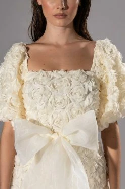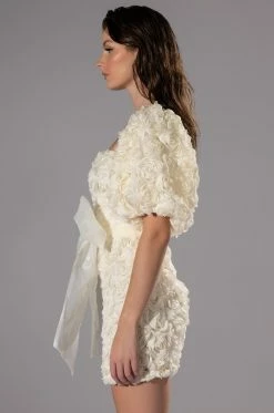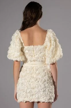 The AKIRA Label In Full Bloom Textured Mini Dress is made from a sheer mesh fabrication and features clustered 3D rose detailing, a square neckline, long, puffed sleeves, a tulle self tie waist, a bodycon fit, a mini length silhouette, slick polyester lining, and a tonal back zipper closure.