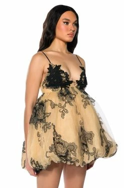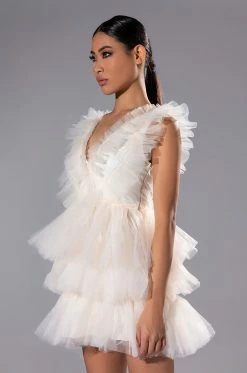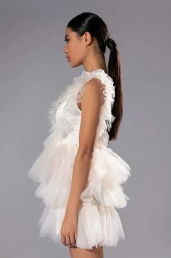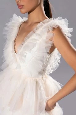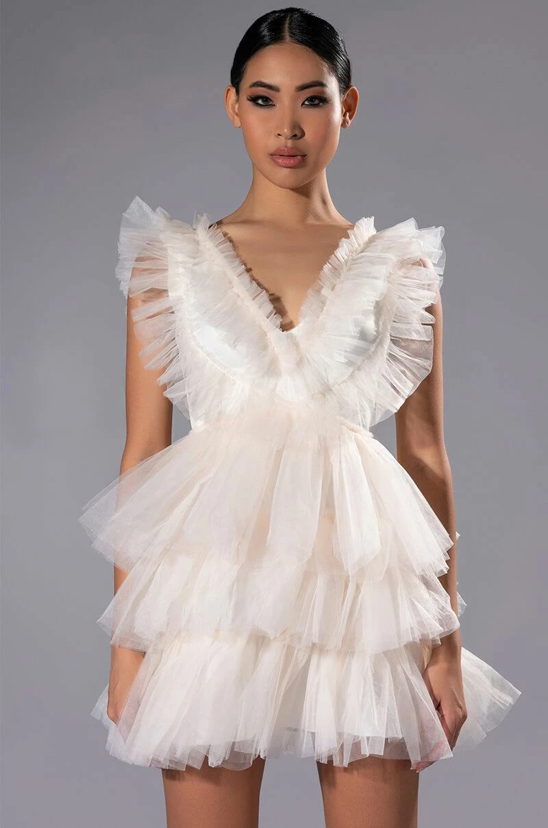 The AKIRA Label In The Garden Tulle Mini Dress features a voluminous tulle fabrication, a plunging neckline, wide tank straps, and a soft satin lining. Complete with a tiered tulle skirt, a cinched waist ,and a concealed side zipper closure.