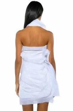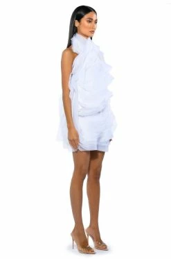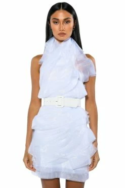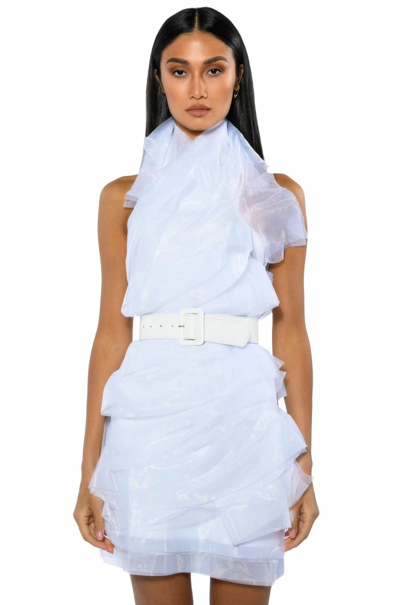 The AKIRA Label Isadora Belted Halter Neck Mini Dress is made from a slick fabrication base and features a wrapped snap button halter neckline, layered tulle detailing, a bodycon fit, a mini length silhouette, and a tonal side zipper closure. Complete with an included, adjustable vegan leather belt and a coordinating tulle sash to switch between while always staying cinched.