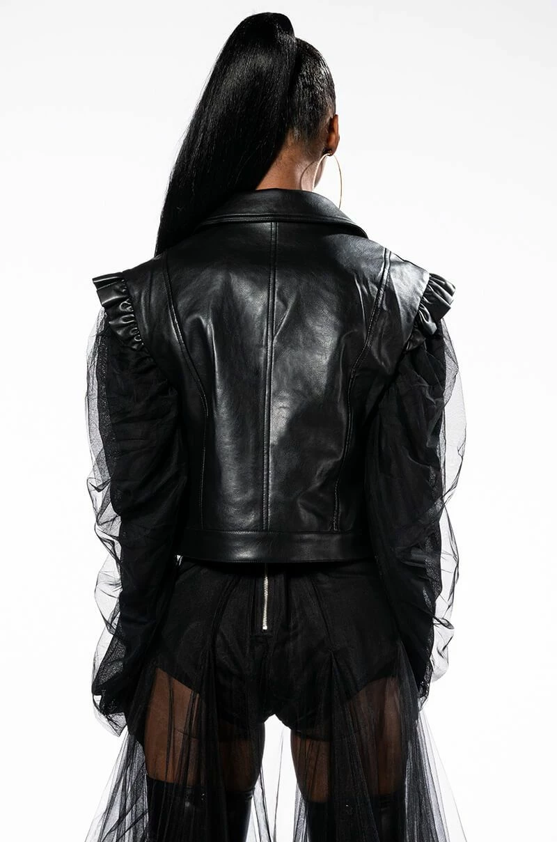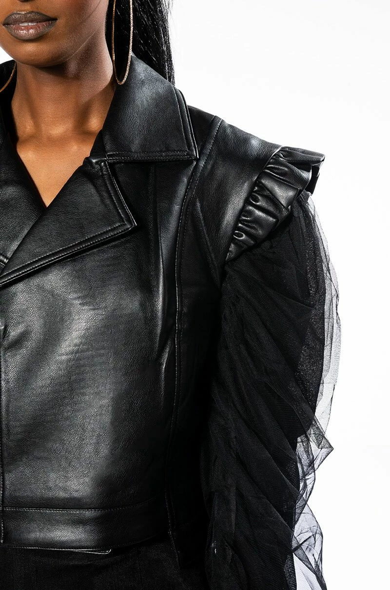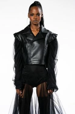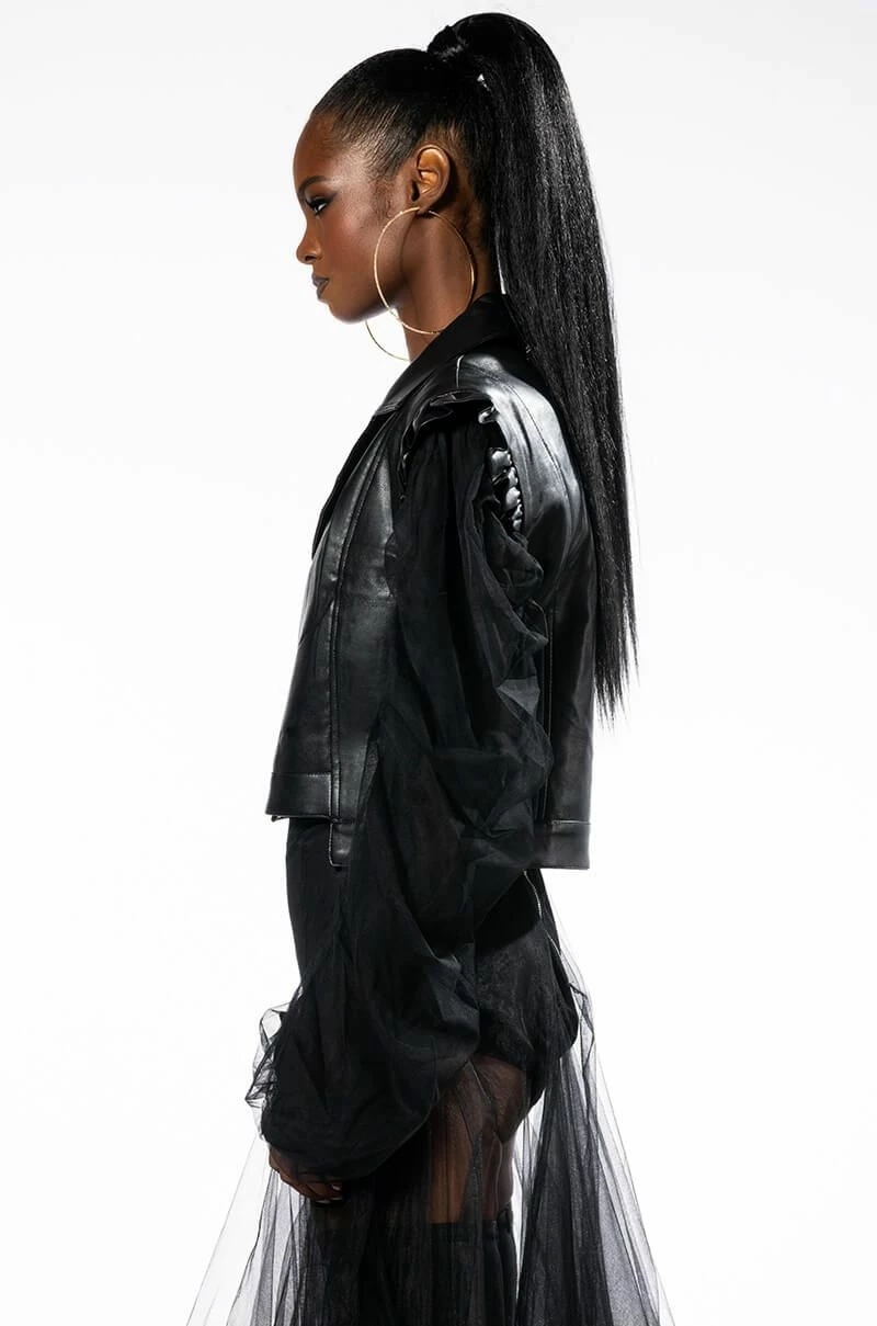 We know you slay all day, every day. The AKIRA Label It’s My Time Moto Jacket With Mesh Puff Sleeve features a structured PU leather fabrication, a classic fold over lapel collar, ruffled shoulder detailing, sheer mesh long blouson sleeves, and button cuff wrists.Complet with a zip front design. Style with distressed denim and your favorite stiletto bootie for a complete look.