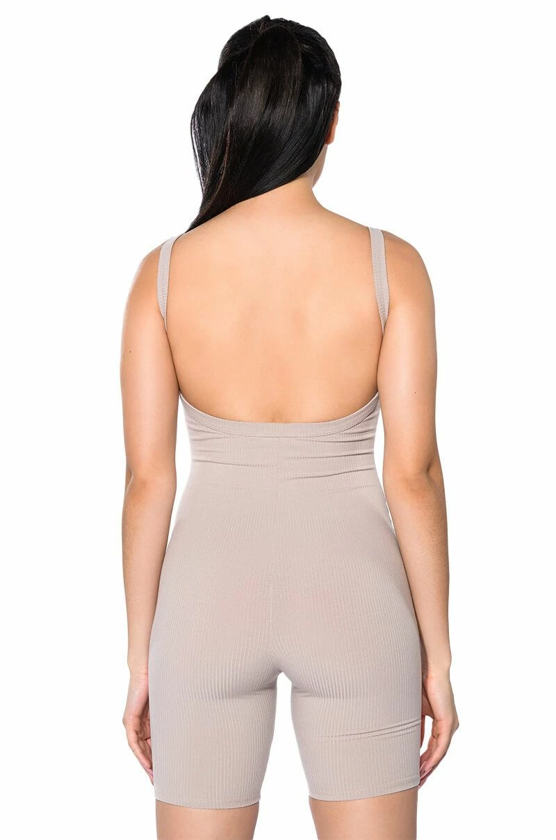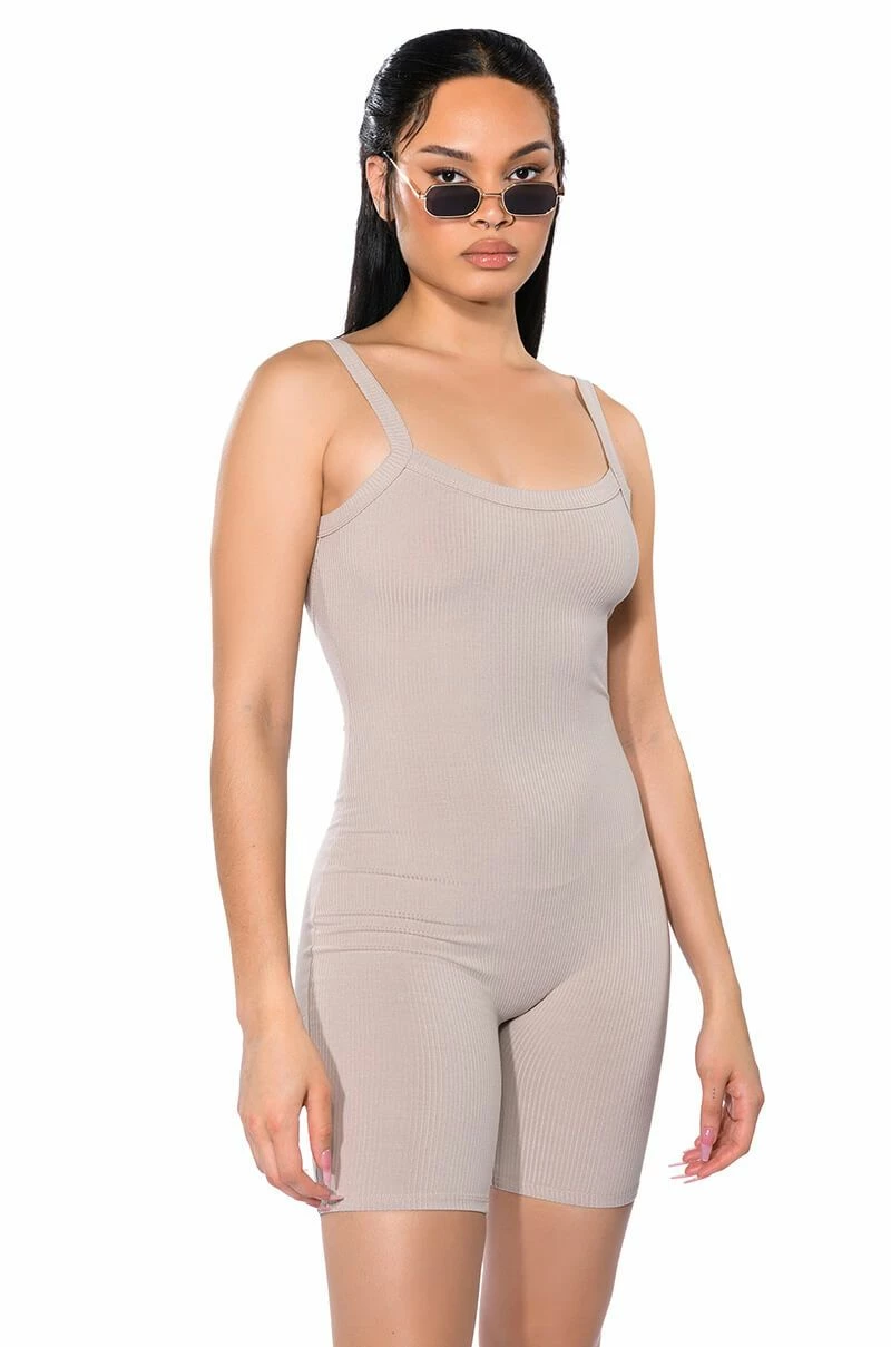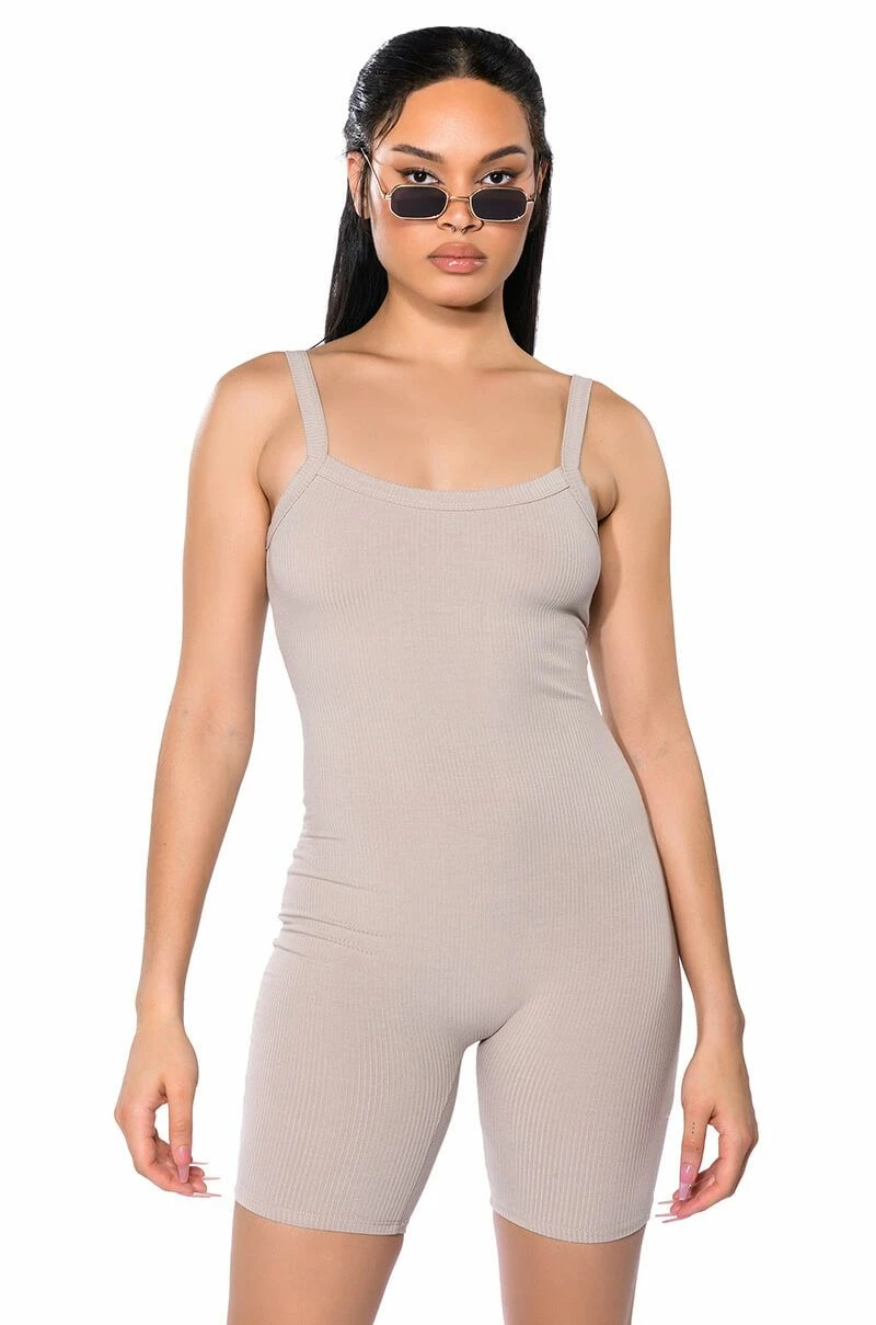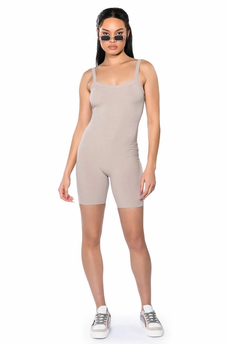 The AKIRA Label Jenna Classic Scoop Back Romper is made from a stretchy ribbed knit fabrication and features a scoop neckline, tank straps, a scooped open back, and a pull-on silhouette. Style this cozy romper with an oversized shacket and chunky sneakers for a chic athleisure look!