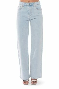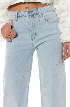The AKIRA Label Jillian Embellished Wide Leg Jeans are made from a cotton blend base fabrication and feature a classic 5 pocket design, high waist, rhinestone embellishments throughout, and a wide leg silhouette. Complete with a slip-on fit. Style with mesh bodysuits or babytees, and chunky platform slides.
