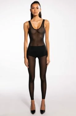 Take care of business in The AKIRA Label Jump On It Sleeveless Mesh Jumpsuit. This sheer mesh one piece features wide tank straps, a scoop neckline, attached skinny leg pants, a sexy bodycon fit, and a slip-on silhouette. Pair this piece under a jean jacket, crop top, and denim shorts for a sexy layered look.